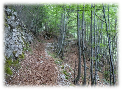 Accompanied by high cloud and occasional shafts of sun we walked up the valley behind the campsite, climbing steadily through lovely woodland to the col Cez Dol at 1632m to the north of Kanjavk one of the higher mountains.