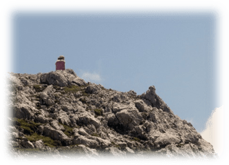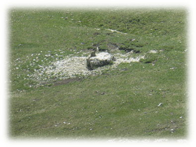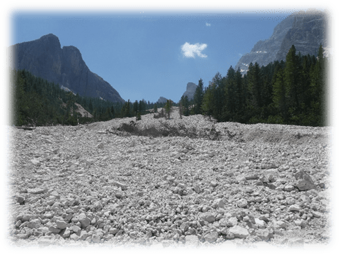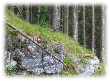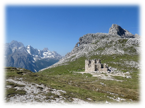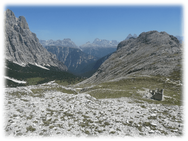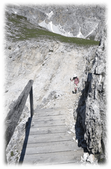 This took us through Misurina past the tourist office and then followed a path ascending westward through trees, scree and then eventually scrambling on loose scree we made it to some broken timber steps and a platform and more steps to the Fourcella Di Popena and a ruined refuge.