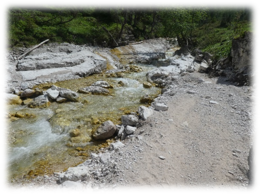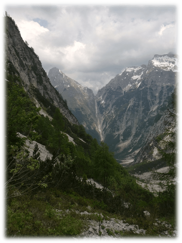 After lunching on the edge of the Col, where there were magnificent views of the impenetrable looking sides of the mountains and deep valleys ahead, we descended steeply into the valley that would lead us back to Trenta.