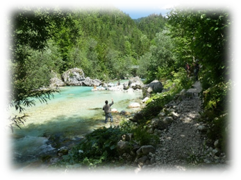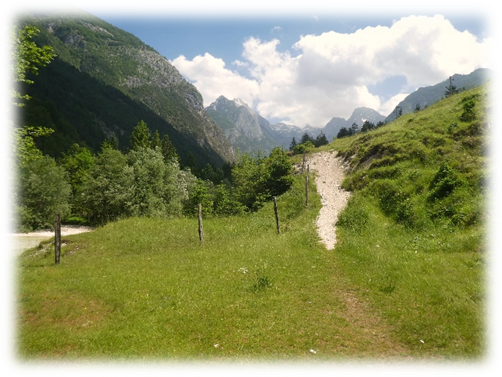 In hot sunshine we took the Soca trail south beside the river. It was pleasant and interesting passing through woods and grassland until we were routed onto a long section of tarmac main road to skirt around some nice-looking camp sites.