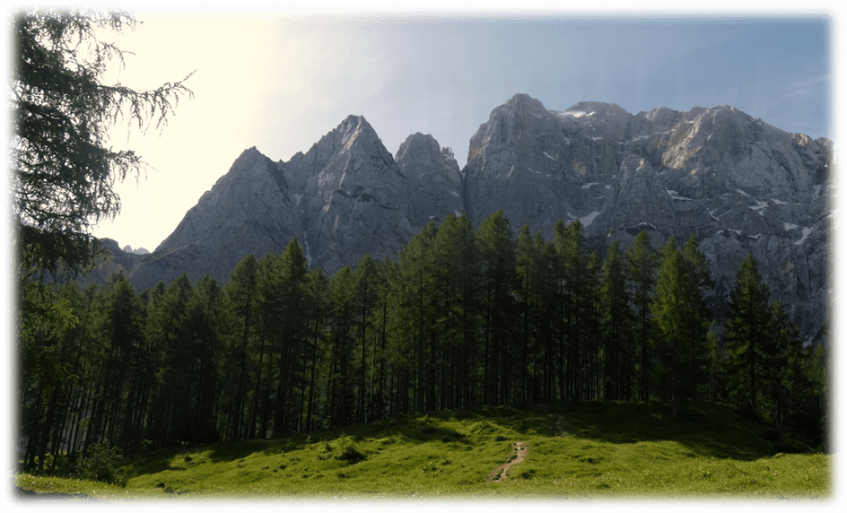 We saw a black squirrel amongst the pine woodland as we descended and stopped at some interpretation boards half way down to view the Prisojnik massive.
