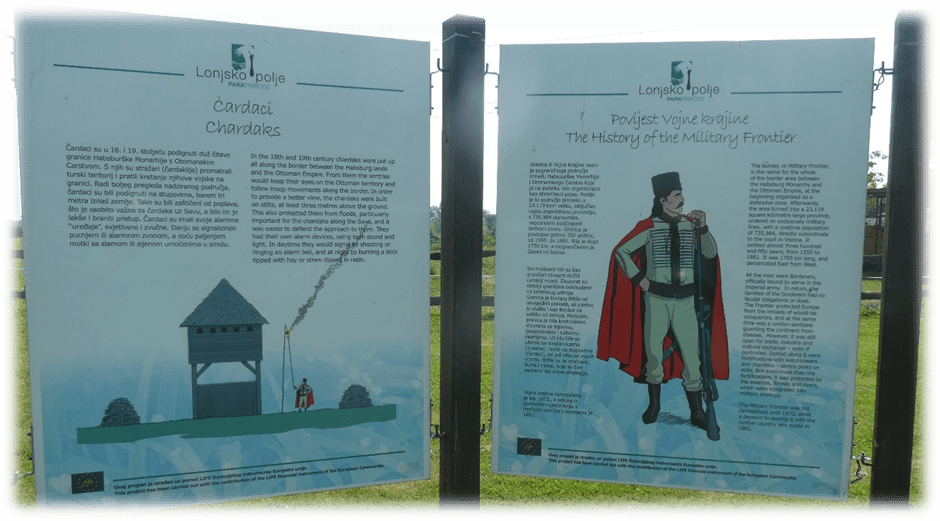 The River Sava was the border between the Austro-Hungarian/Hapsburg Empire and the Turkish/ Otterman Empires between the 16th and 19th century. The bird watching towers were restored and replicated watch towers from that period.