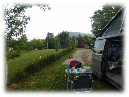 The terrain became more wooded and undulating as we turned south and stopped for lunch beside the Korana river before Slunj. From here it was a short distance to Camp Bear where we secured a nice plot overlooking the road and wooded hills.