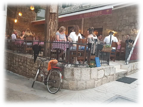 Descending back into the mediaeval town we found a shady restaurant, Konoba Dobuca Ladovina, where we shared a plate of grilled mixed sea food for lunch washed down with a very nice bottle of white wine.