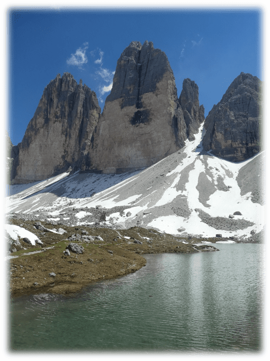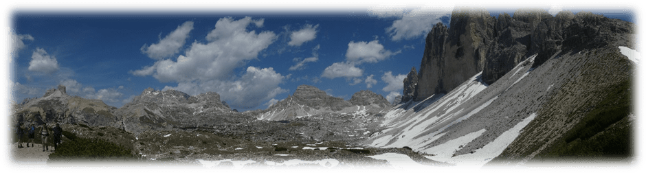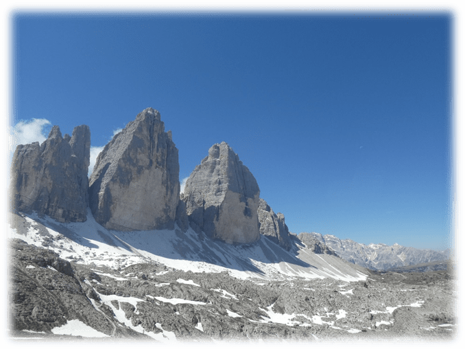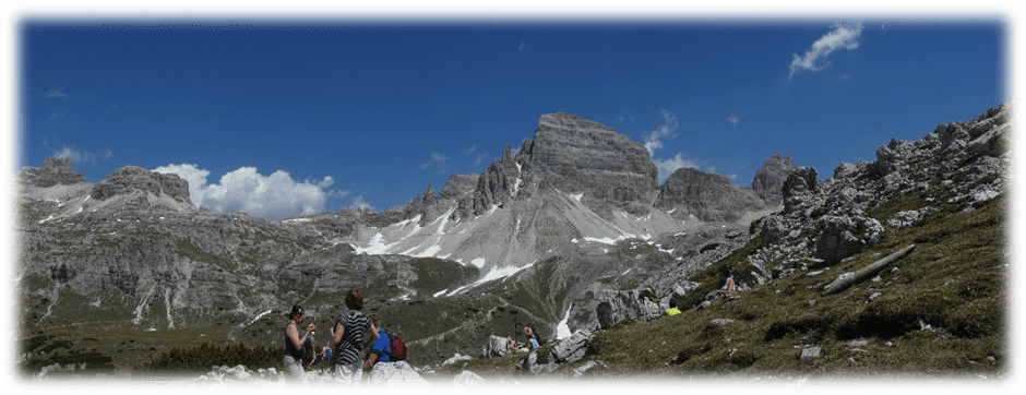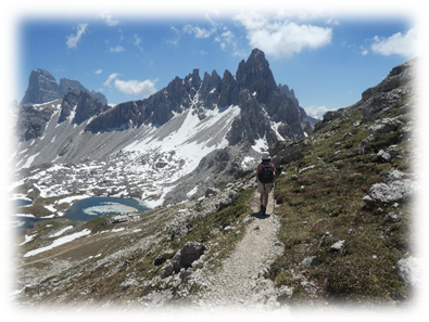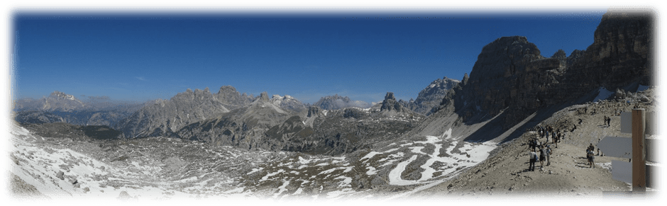 Half-way around at Refugio Locatelli we did a detour onto Sassoon Sesto a small mountain where on top there were just two lads walking through the mountains. So, we had a relatively peaceful lunch gazing at the many extraordinary different shaped peaks around us.