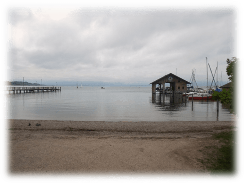 It took us through the lakeside holiday resort catchily named Anlegesteg der Chiemseeschifffahrt on Lake Chiemsee. Stopping there seemed incongruous to us travelling at what seemed a different scale, but the loos were welcome. The sun was forcing its way through low cloud and it was all rather pleasant.