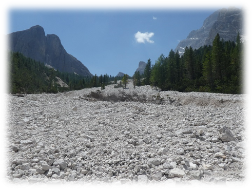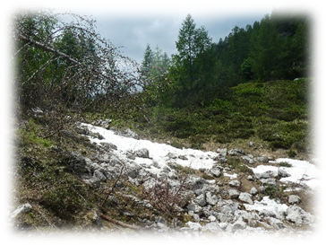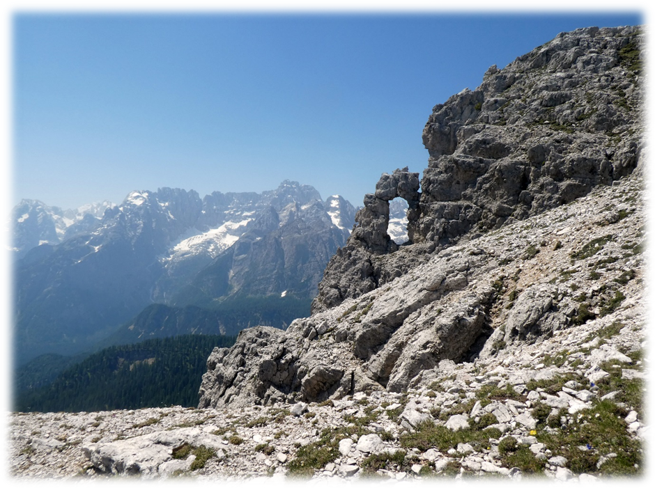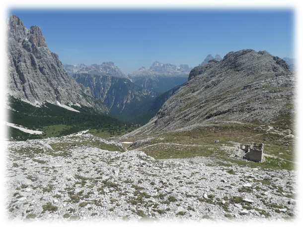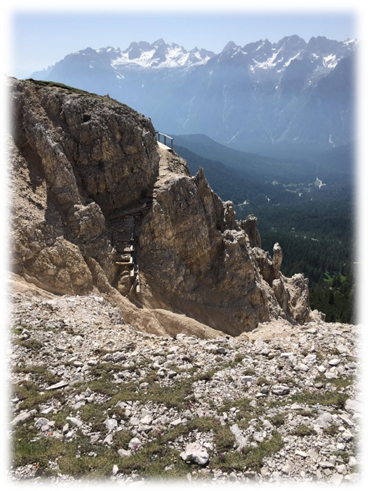 This took us through Misurina past the tourist office and then followed a path ascending westward through trees, scree and then eventually scrambling on loose scree we made it to some broken timber steps and a platform and more steps to the Fourcella Di Popena and a ruined refuge.