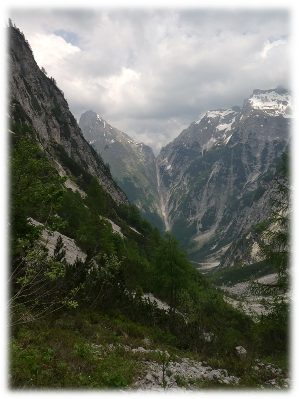 After lunching on the edge of the Col, where there were magnificent views of the impenetrable looking sides of the mountains and deep valleys ahead, we descended steeply into the valley that would lead us back to Trenta.