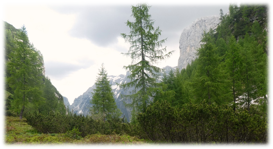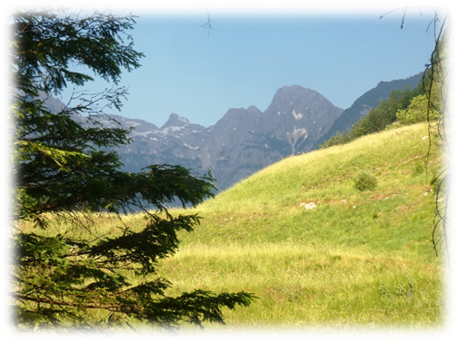 Accompanied by high cloud and occasional shafts of sun we walked up the valley behind the campsite, climbing steadily through lovely woodland to the col Cez Dol at 1632m to the north of Kanjavk one of the higher mountains.