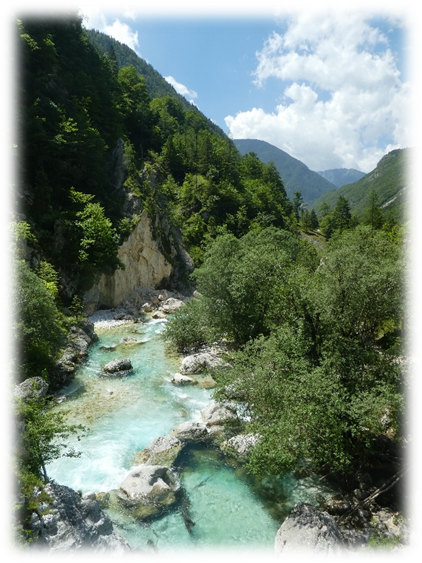 In hot sunshine we took the Soca trail south beside the river. It was pleasant and interesting passing through woods and grassland until we were routed onto a long section of tarmac main road to skirt around some nice-looking camp sites.