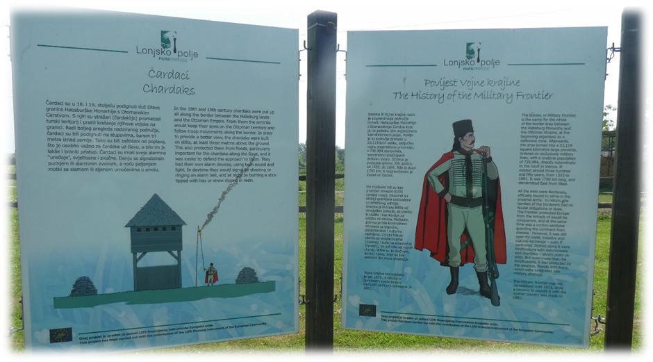 The River Sava was the border between the Austro-Hungarian/Hapsburg Empire and the Turkish/ Otterman Empires between the 16th and 19th century. The bird watching towers were restored and replicated watch towers from that period.