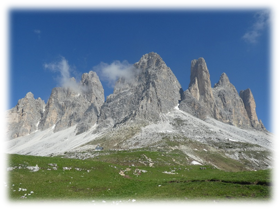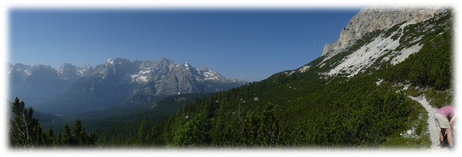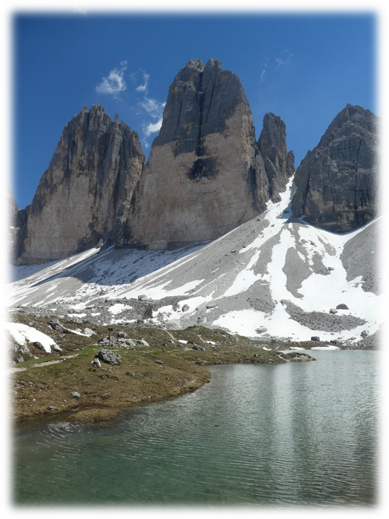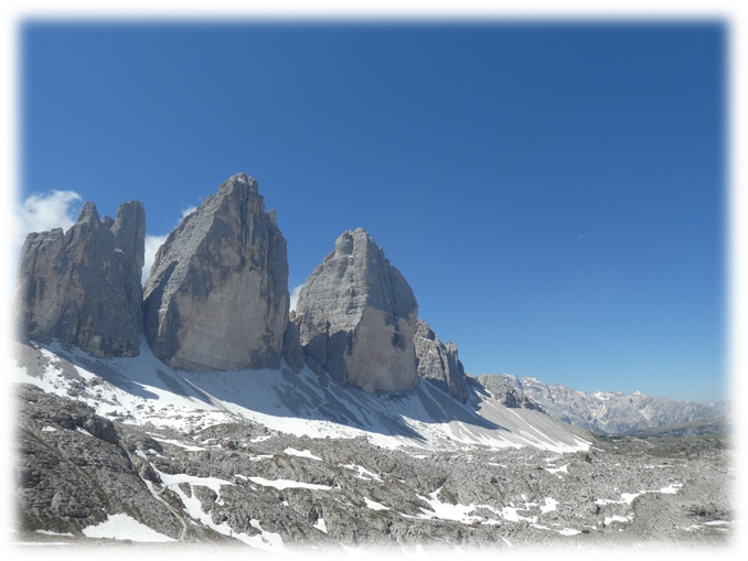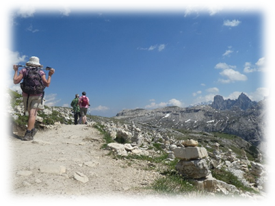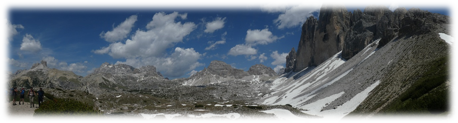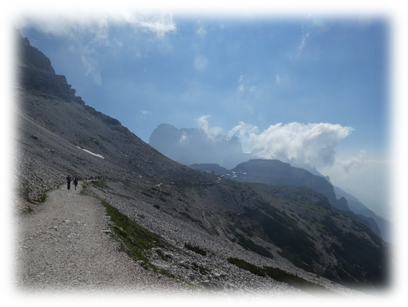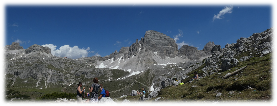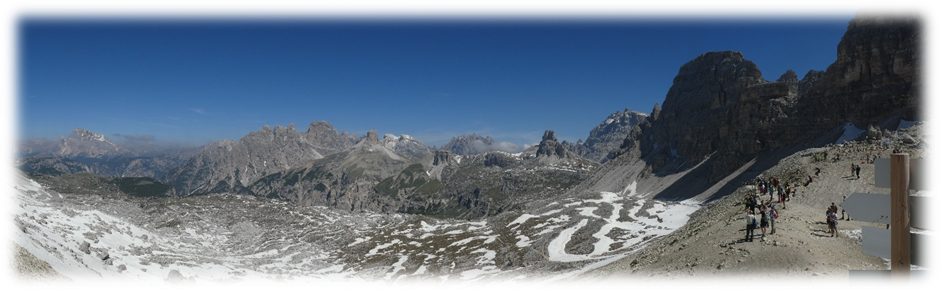 Half-way around at Refugio Locatelli we did a detour onto Sassoon Sesto a small mountain where on top there were just two lads walking through the mountains. So, we had a relatively peaceful lunch gazing at the many extraordinary different shaped peaks around us.