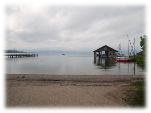 It took us through the lakeside holiday resort catchily named Anlegesteg der Chiemseeschifffahrt on Lake Chiemsee. Stopping there seemed incongruous to us travelling at what seemed a different scale, but the loos were welcome. The sun was forcing its way through low cloud and it was all rather pleasant.