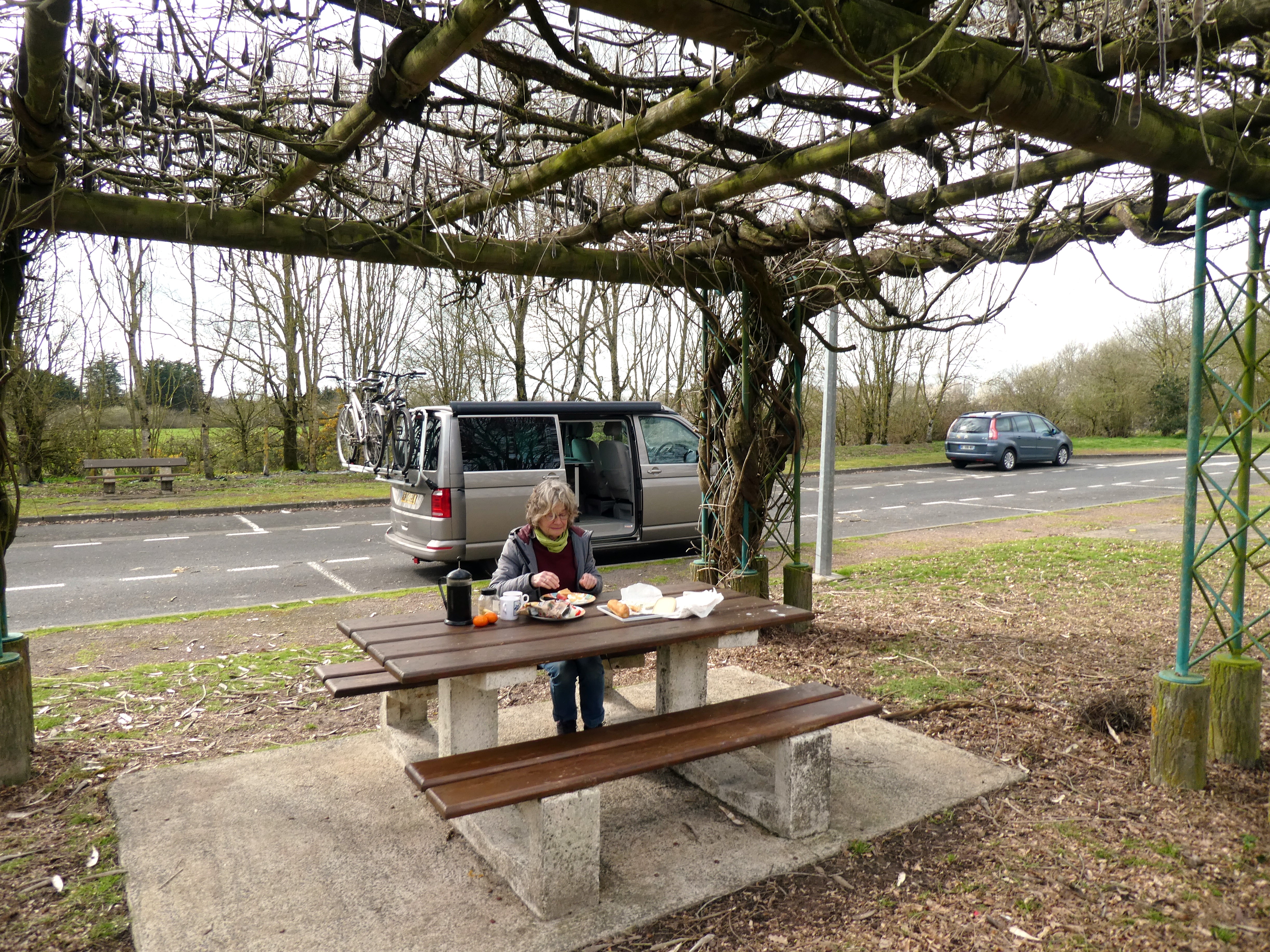 We then make good progress at a sedate 65mph stopping for diesel and some food in a Super U in Nantes. We recall stopping near here for lunch last year whilst travelling down to Rosnay in the Brennes. We then drive back on the autoroute where we stop for lunch. A hazy March sun meant it was just warm enough to use the picnic tables.