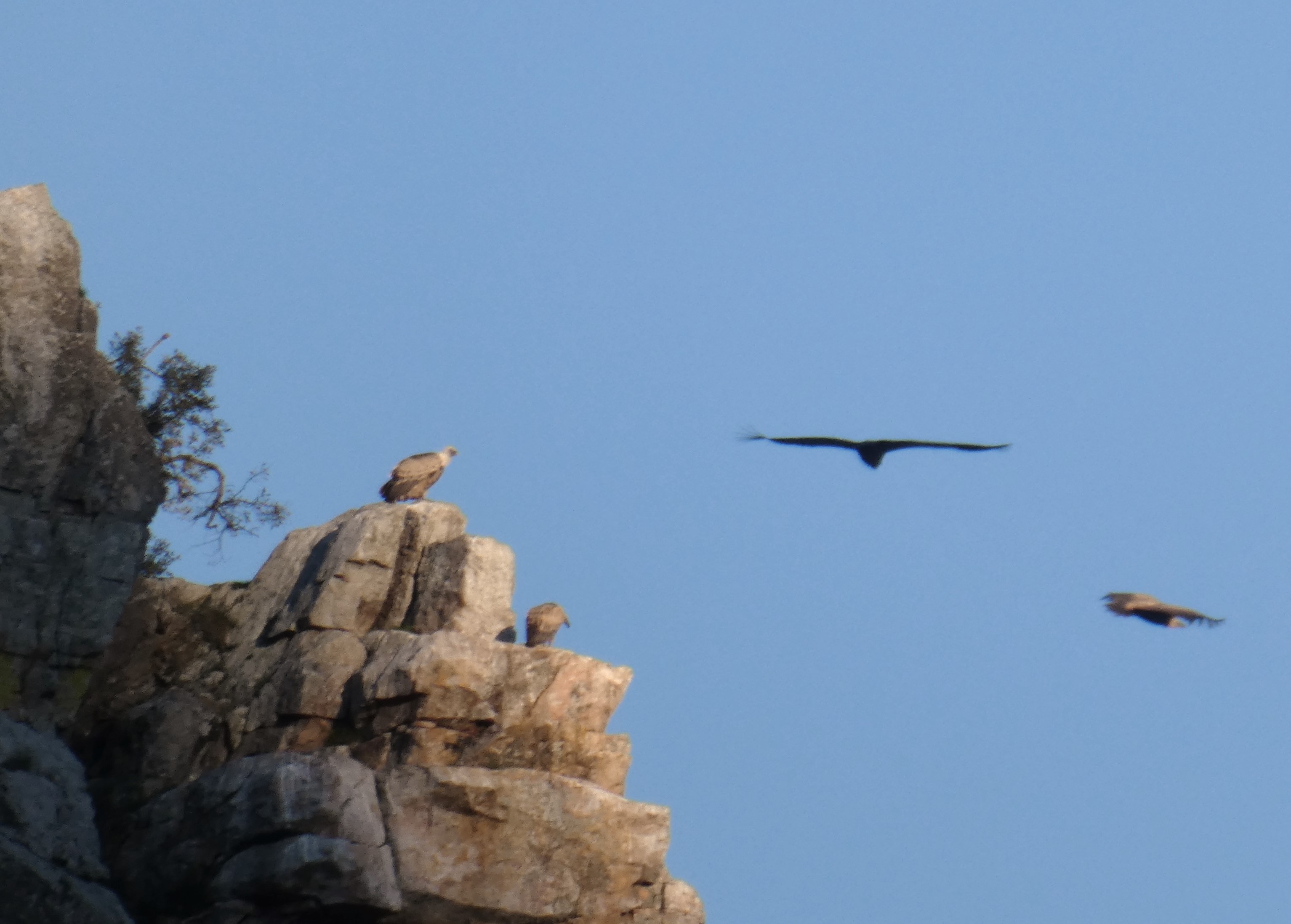 At first, we thought they were Black Vultures, but eventually decided theywere Griffin Vultures flying around us. It was very cold but fascinating, so we stayed and brewed up and had a bite to eat before moving on west and then south to Caceres.