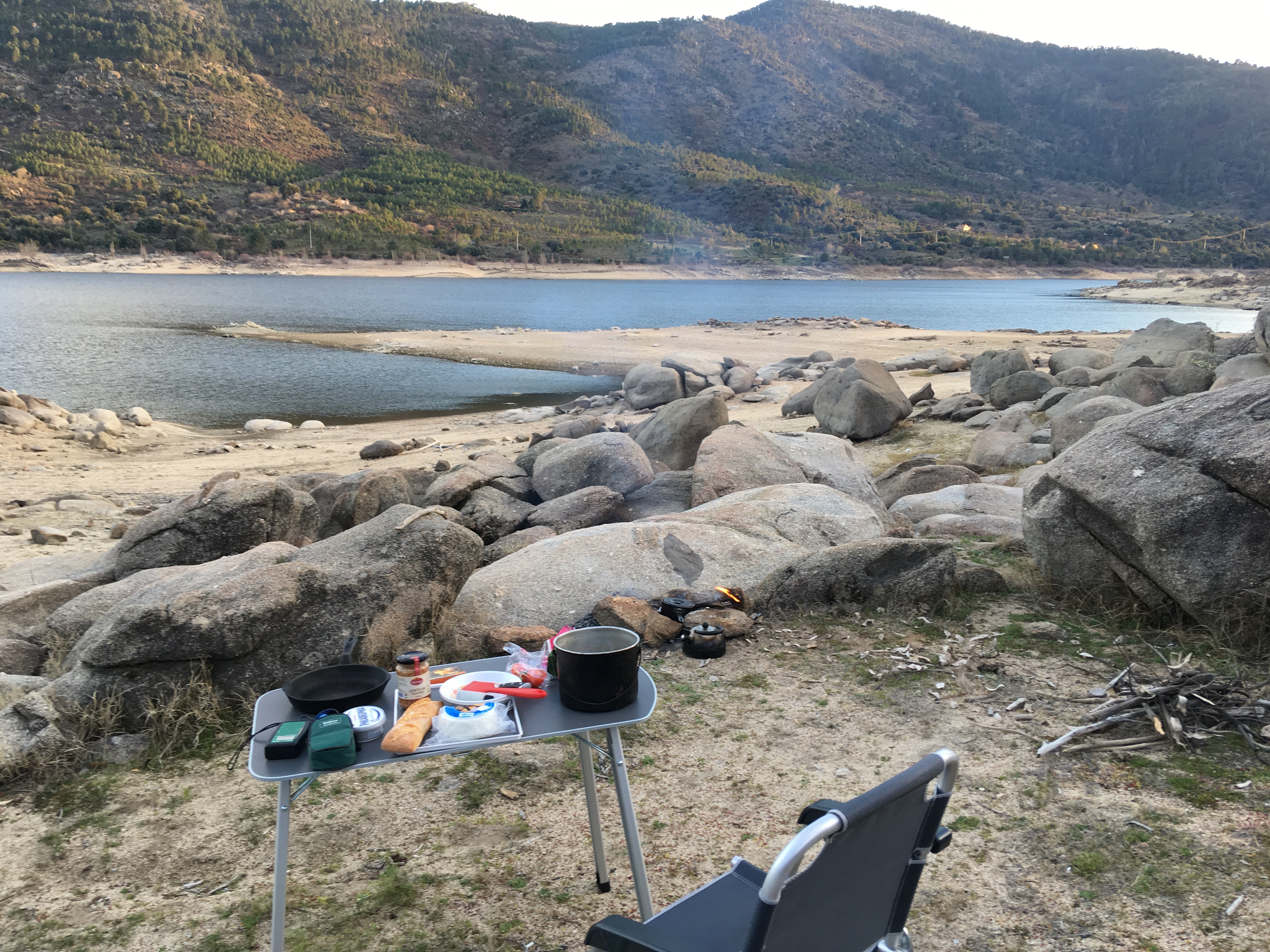 It was lovely to return to our spot and cook spinach, goat’s cheese and lentils on the fire overlooking the lake.