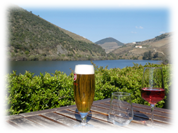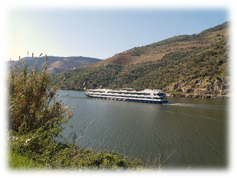 In Pinhao a cruise boat was disgorging its passengers on the quayside, so we moved on quickly cycling on down the river towards Porto stopping before the auto route bridge that crossed the river near Peso la Regula.