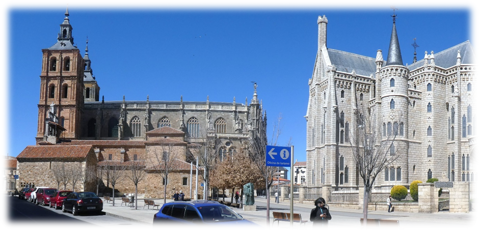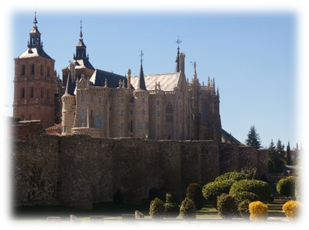 From here we drove to Astorga and parked by Antoni Gaudi’s bizarre Palacio Episcopal a dark granite turreted, moated castle which stands next door to the cathedral.