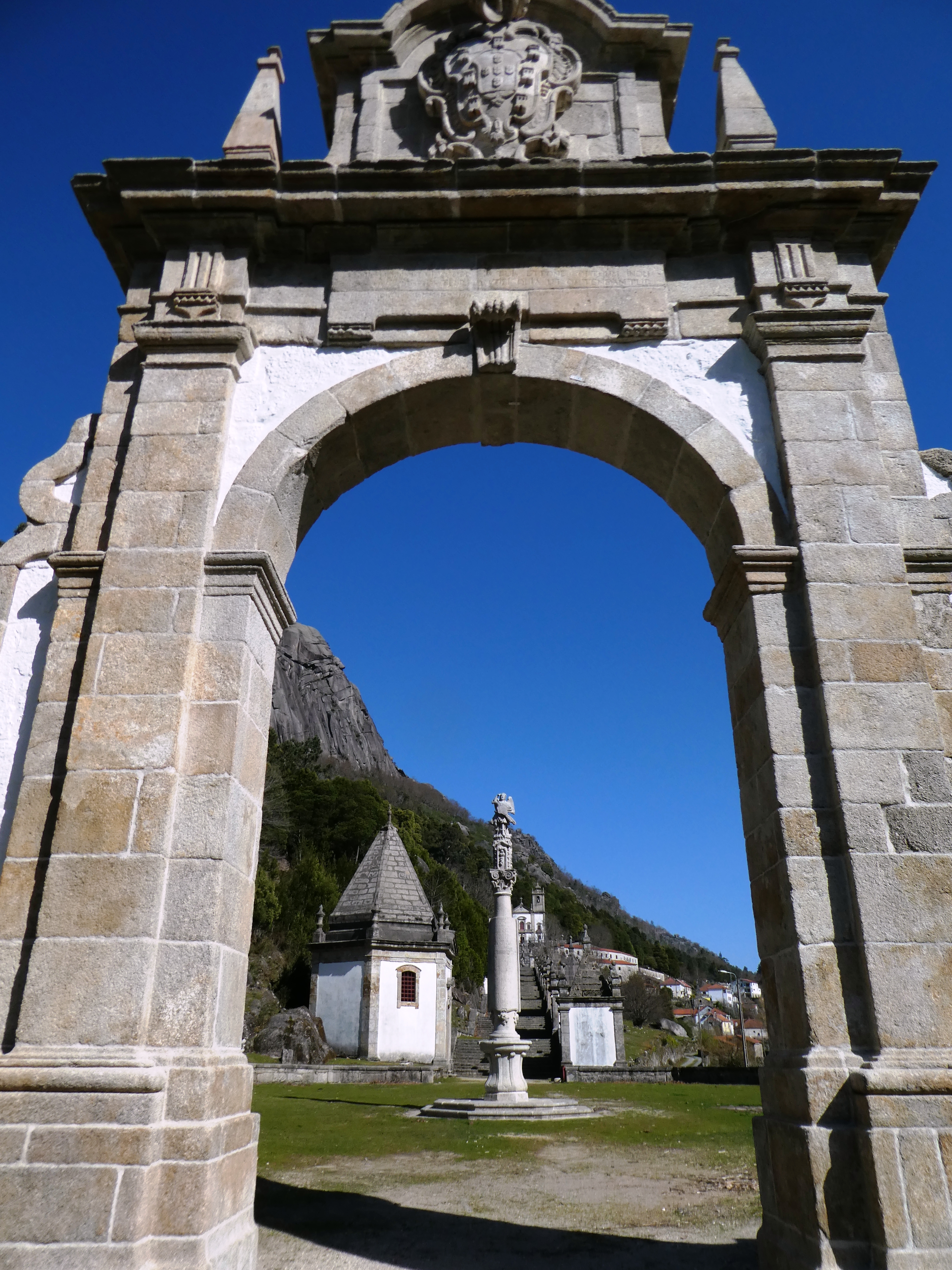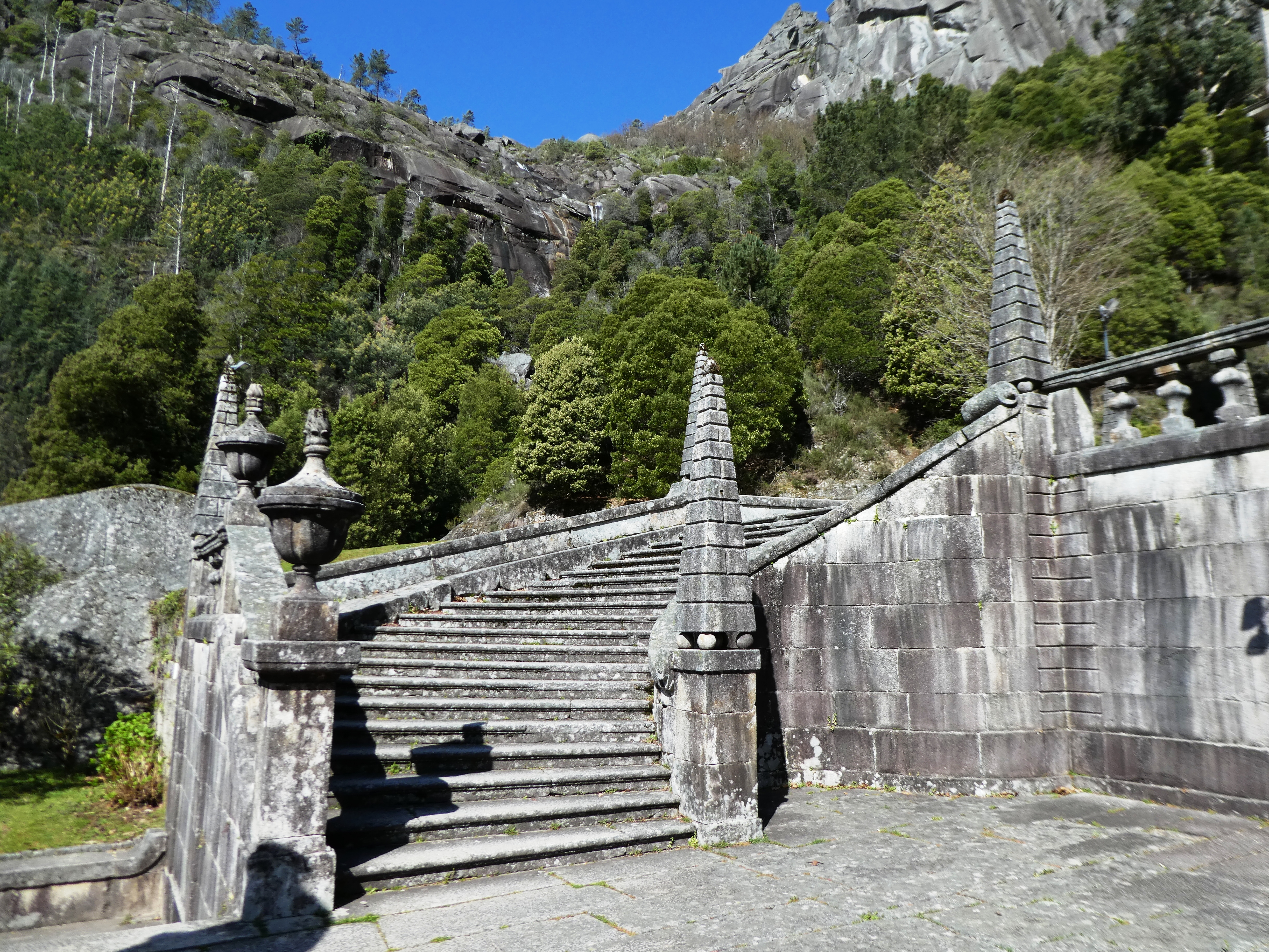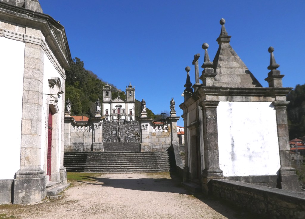 It has a set of ornate steps leading from the church across different terraces flanked on both sides by small chapels. These chapels contain life size models depicting the different stages of the cross with the bottom terrace leading through a gateway down the valley below. It is stunning.