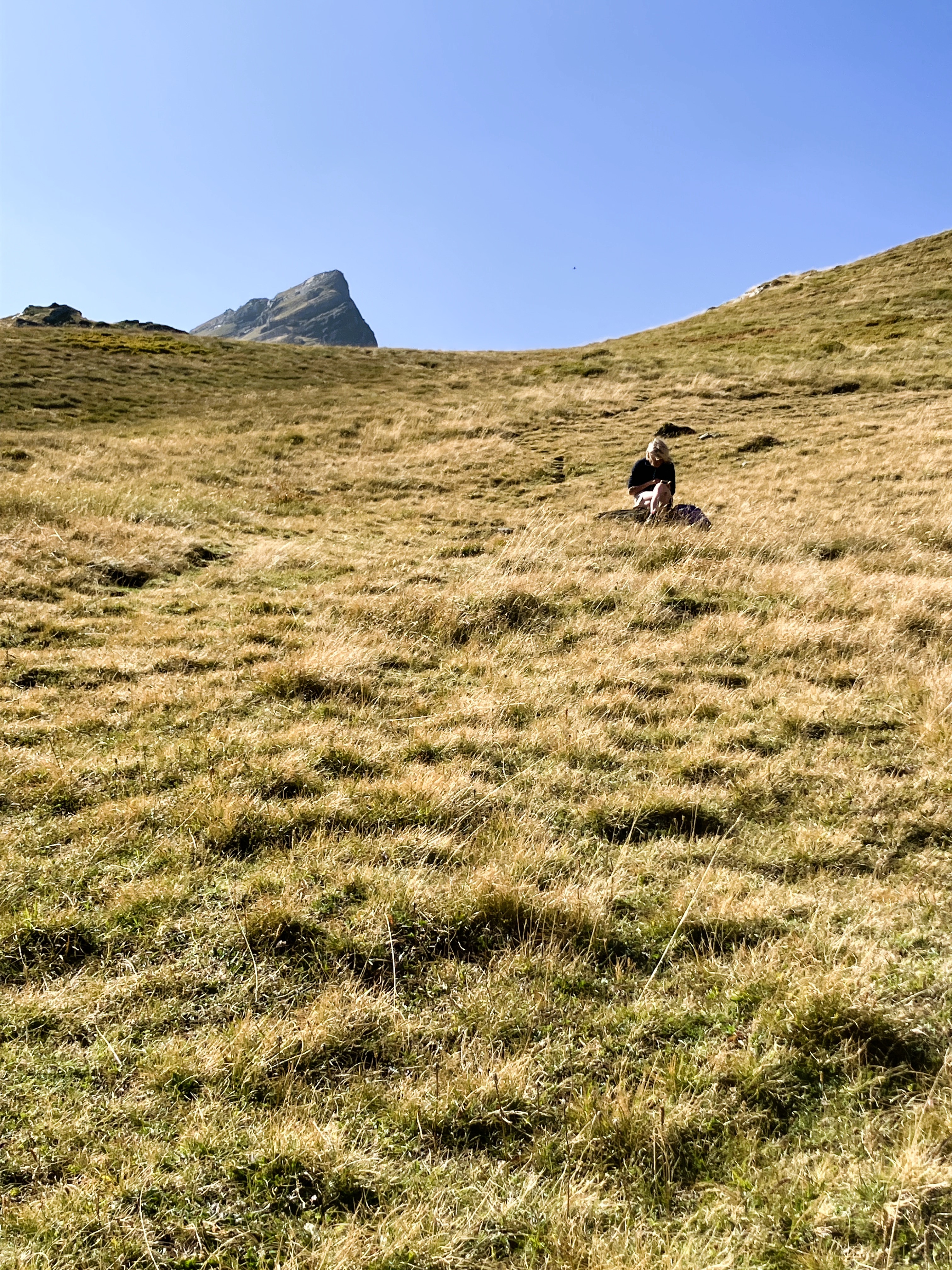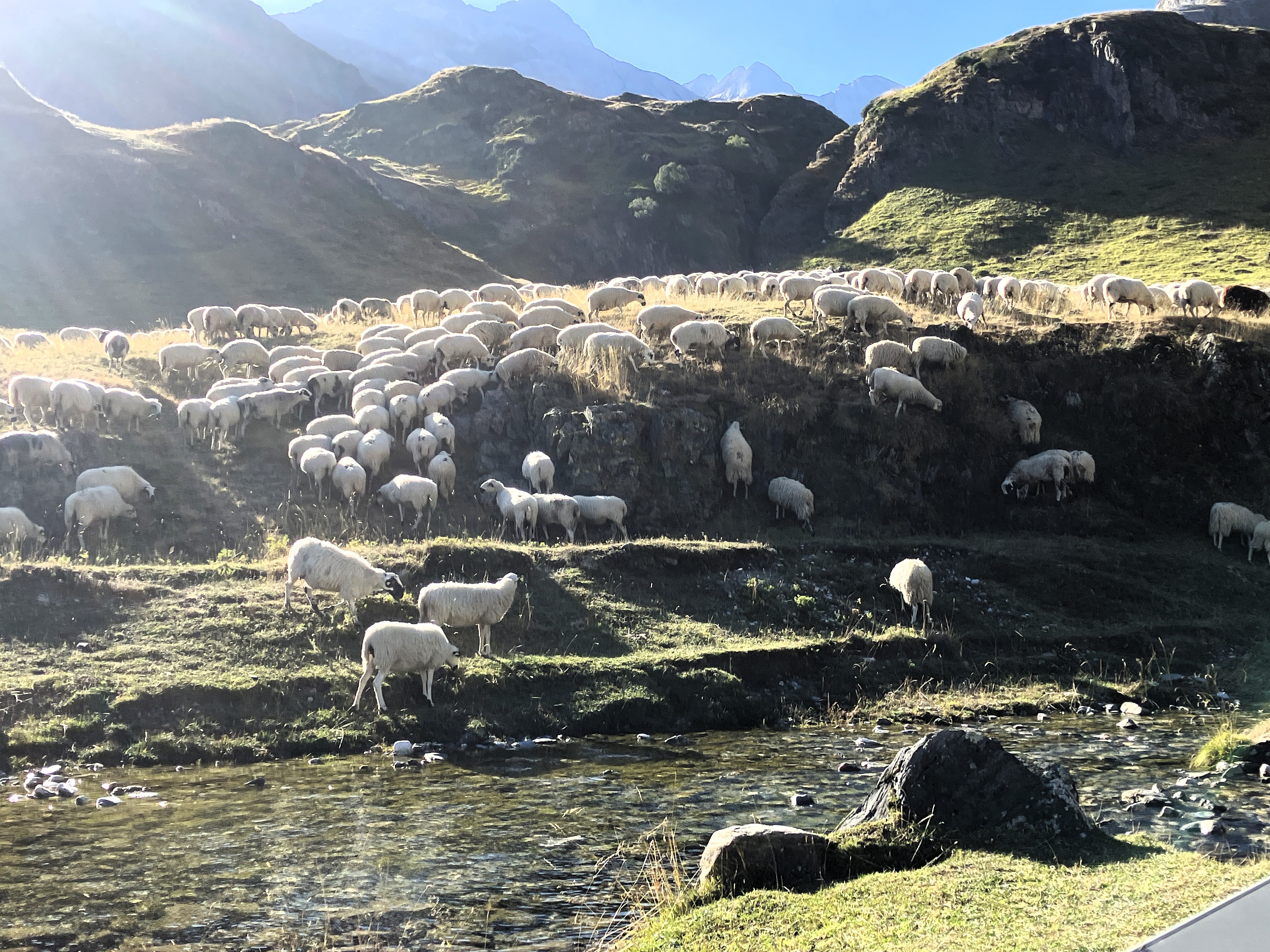The shepherd and his dog, drove the sheep up the valley towards the Cabane de Lourdes, the way we had walked the previous day.