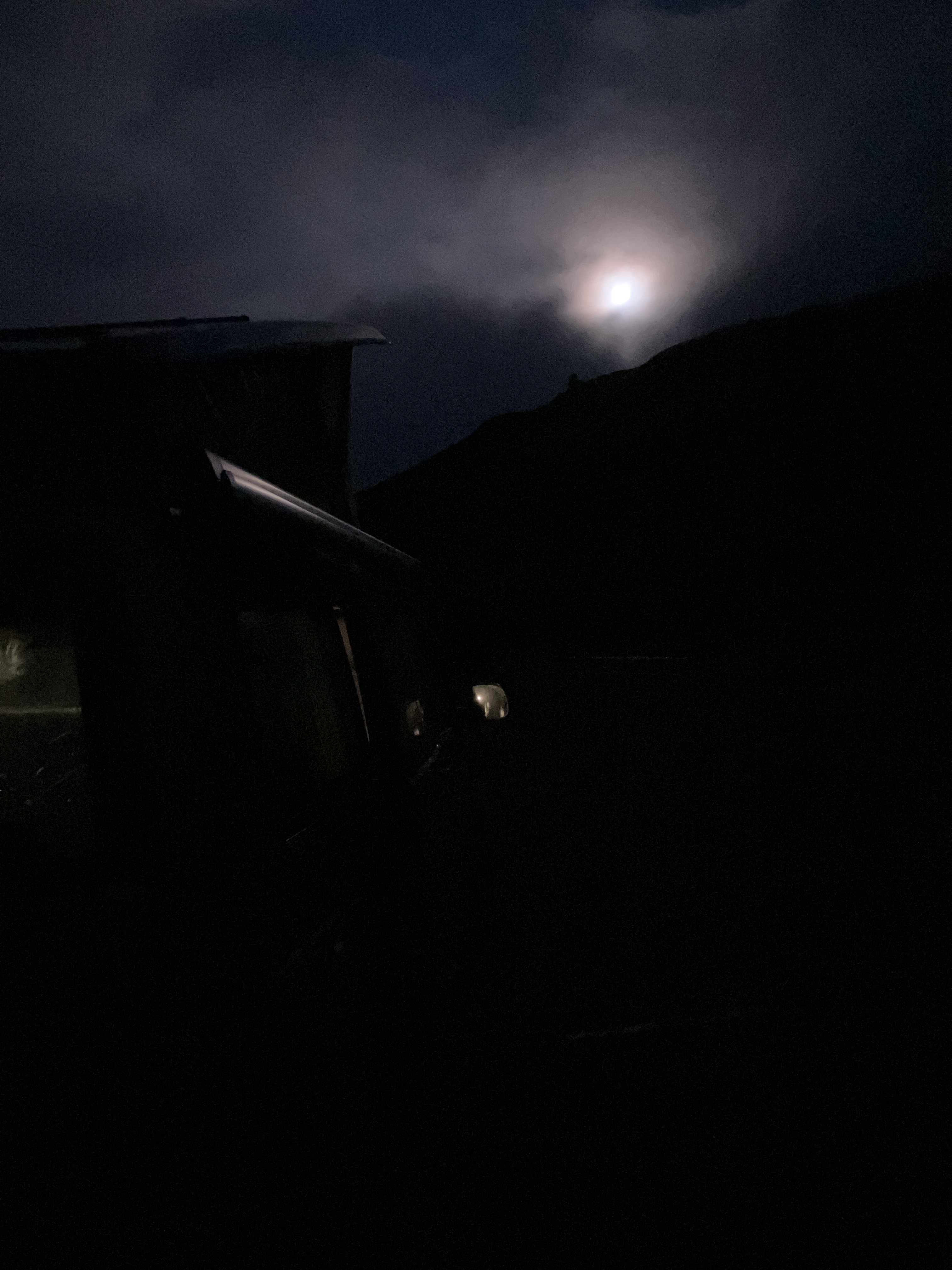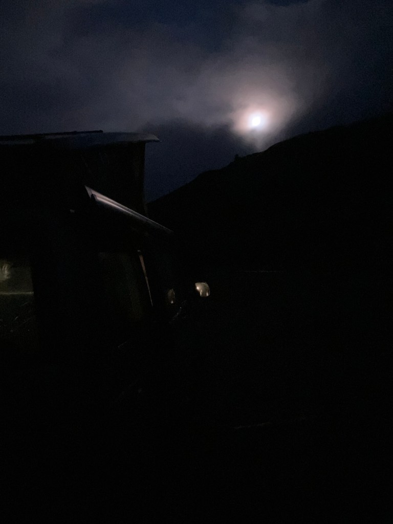 Eating in the van with the heating on was a must. As the temperatures had quickly dropped, the compensation was the bright moon which dominated the sky.