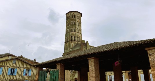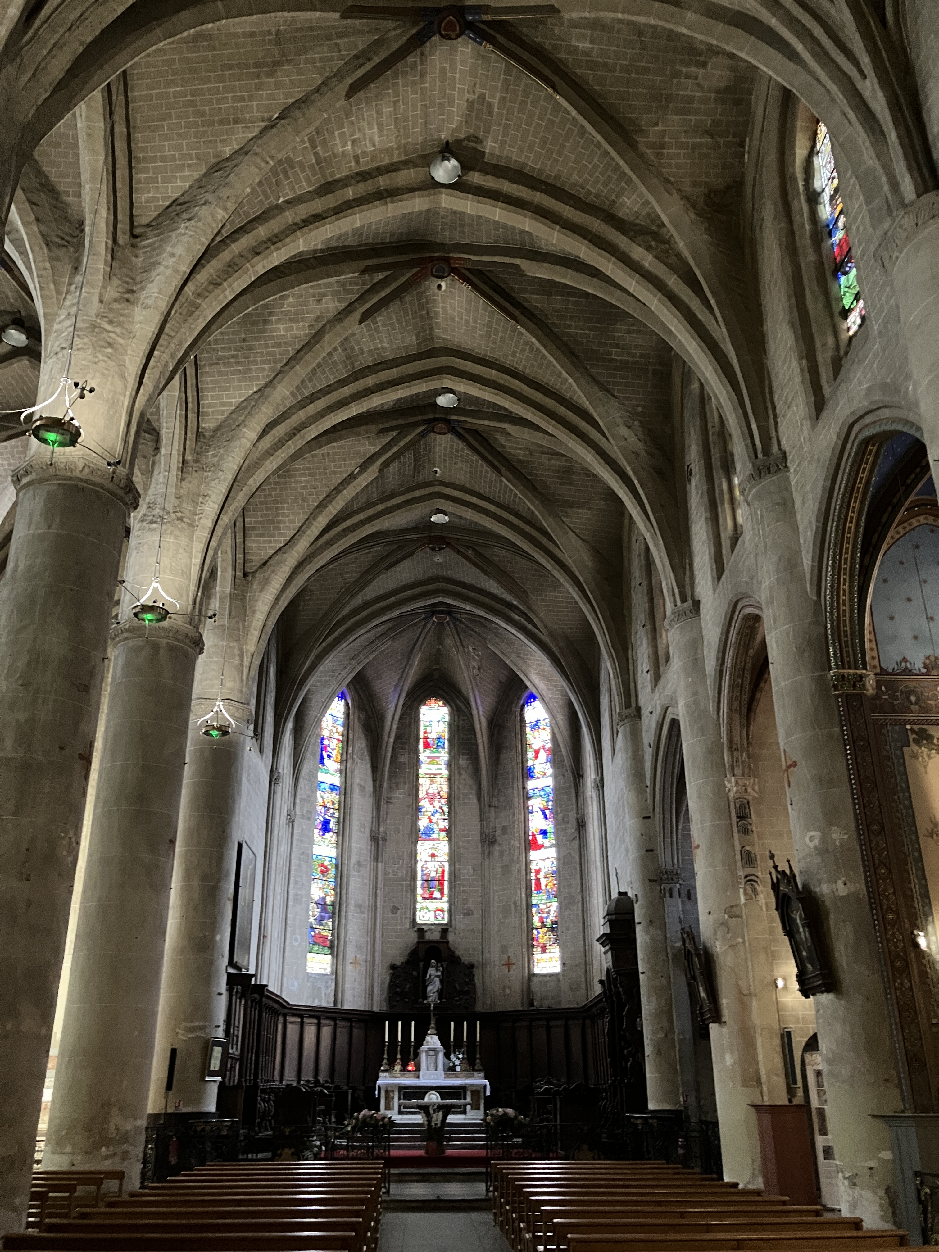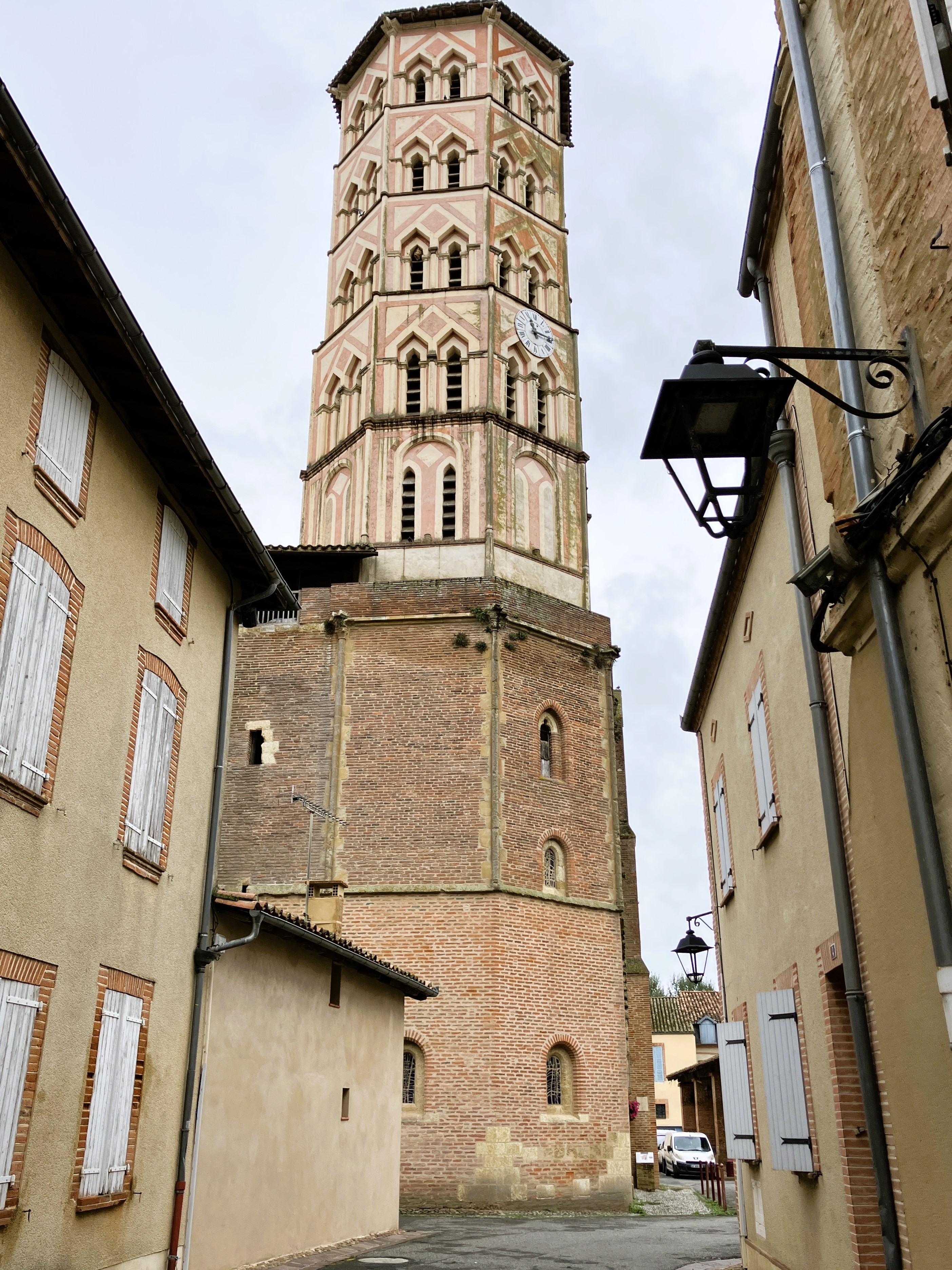 It was very windy and twisty and up and down over the ridges. The cathedral at Lombez caught our attention with its high octagonal red and white bricked tower, a former bishops palace that in 1801 had been converted to its present form.