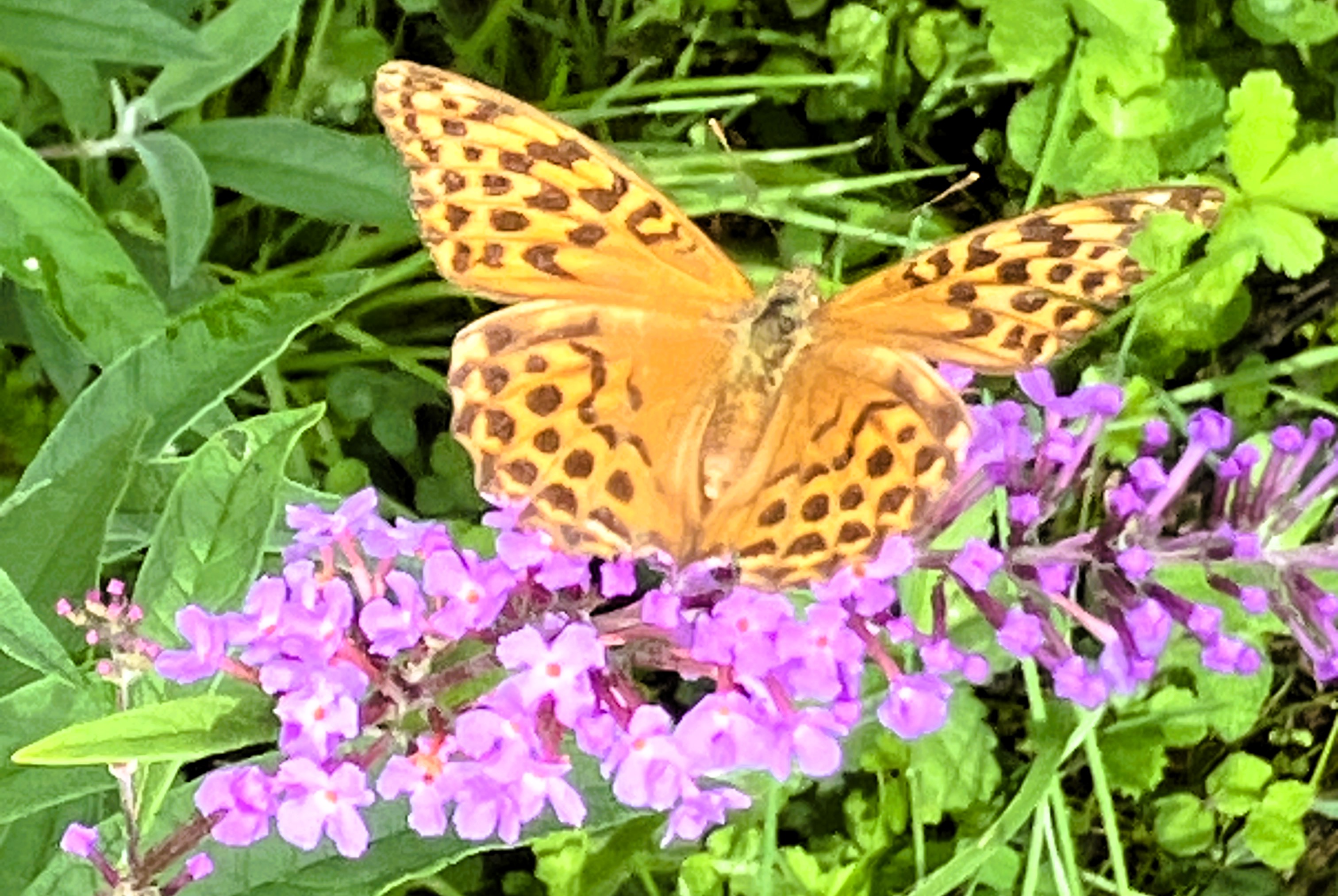 It was misty with hazy sunshine as we picked up a baguette in Lalinde and cycled north through old woodlands to Saint Alvere where we had coffee. It was warming up so there were butterflies and flowers as well as an alive deer and then a dead one beside the road.
