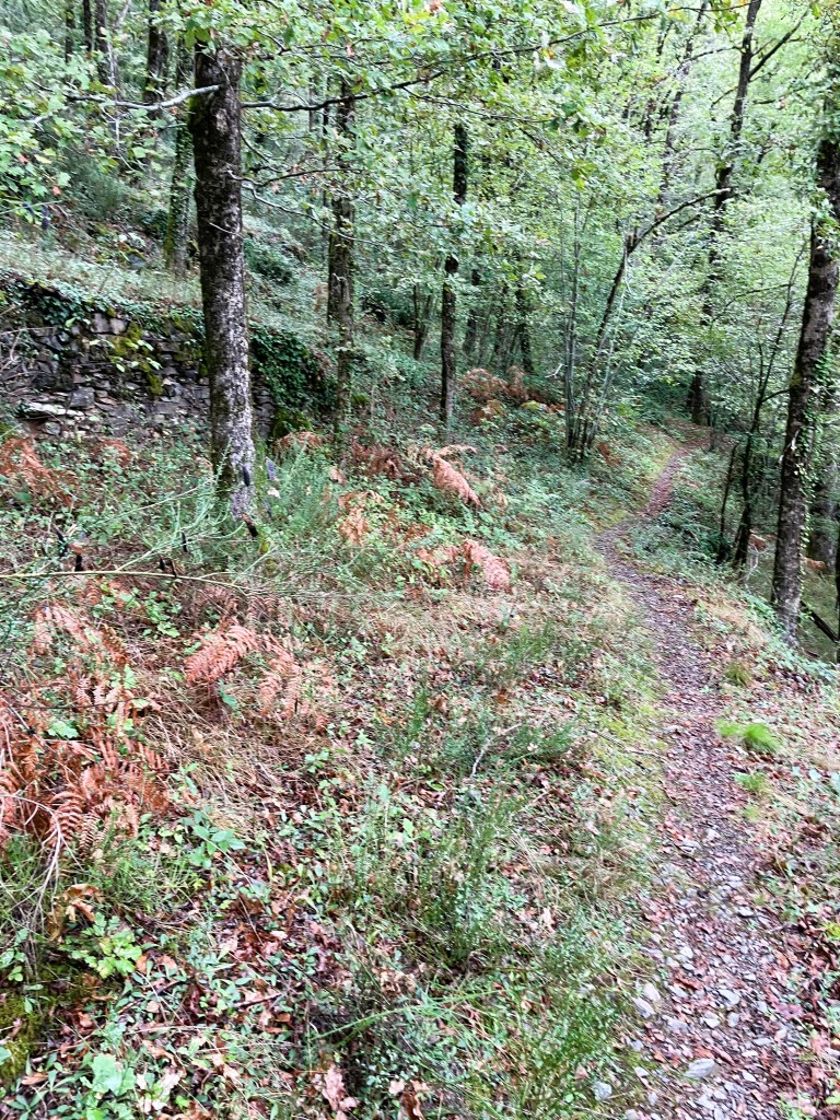 We followed the yellow signs steeply to the river where there seemed to be no continuing path so we had to retrace our steps steeply up the hill until we found another path further down the valley which we took.