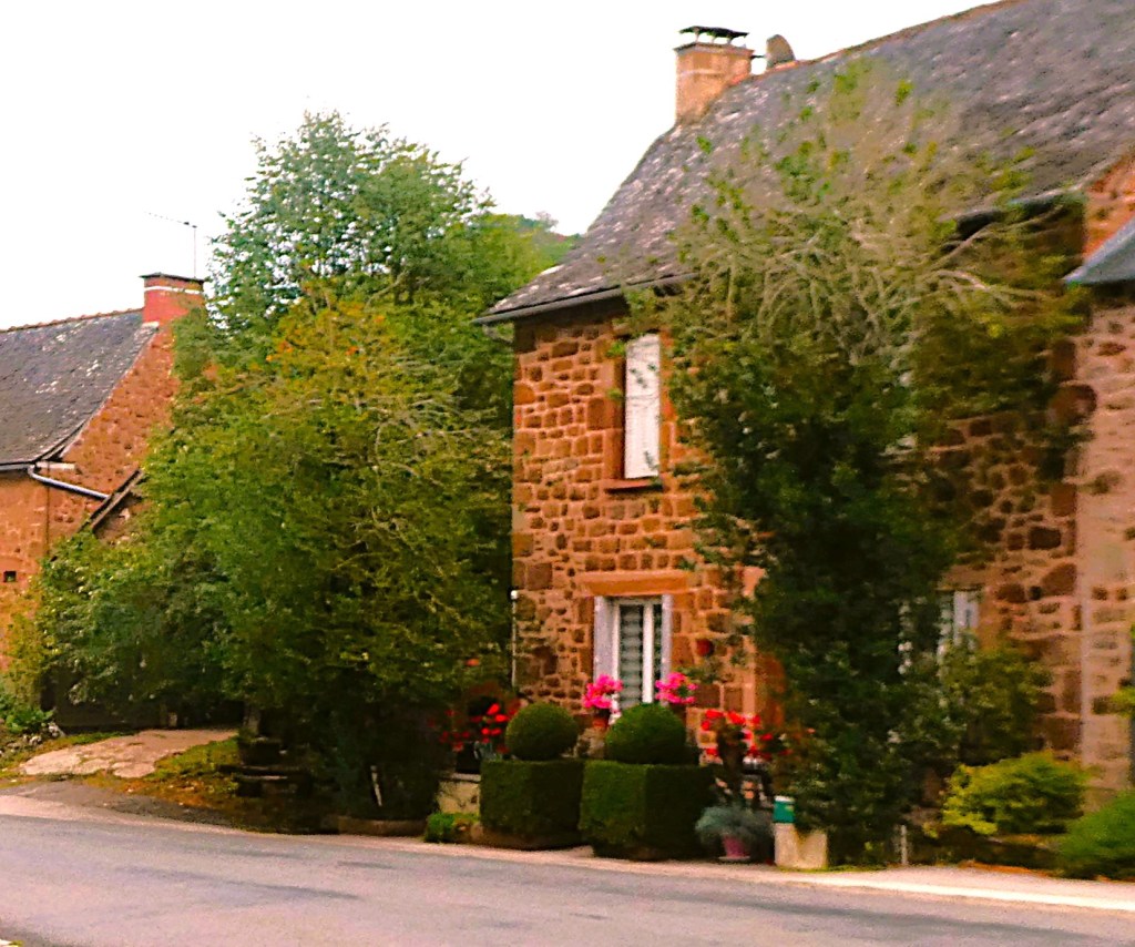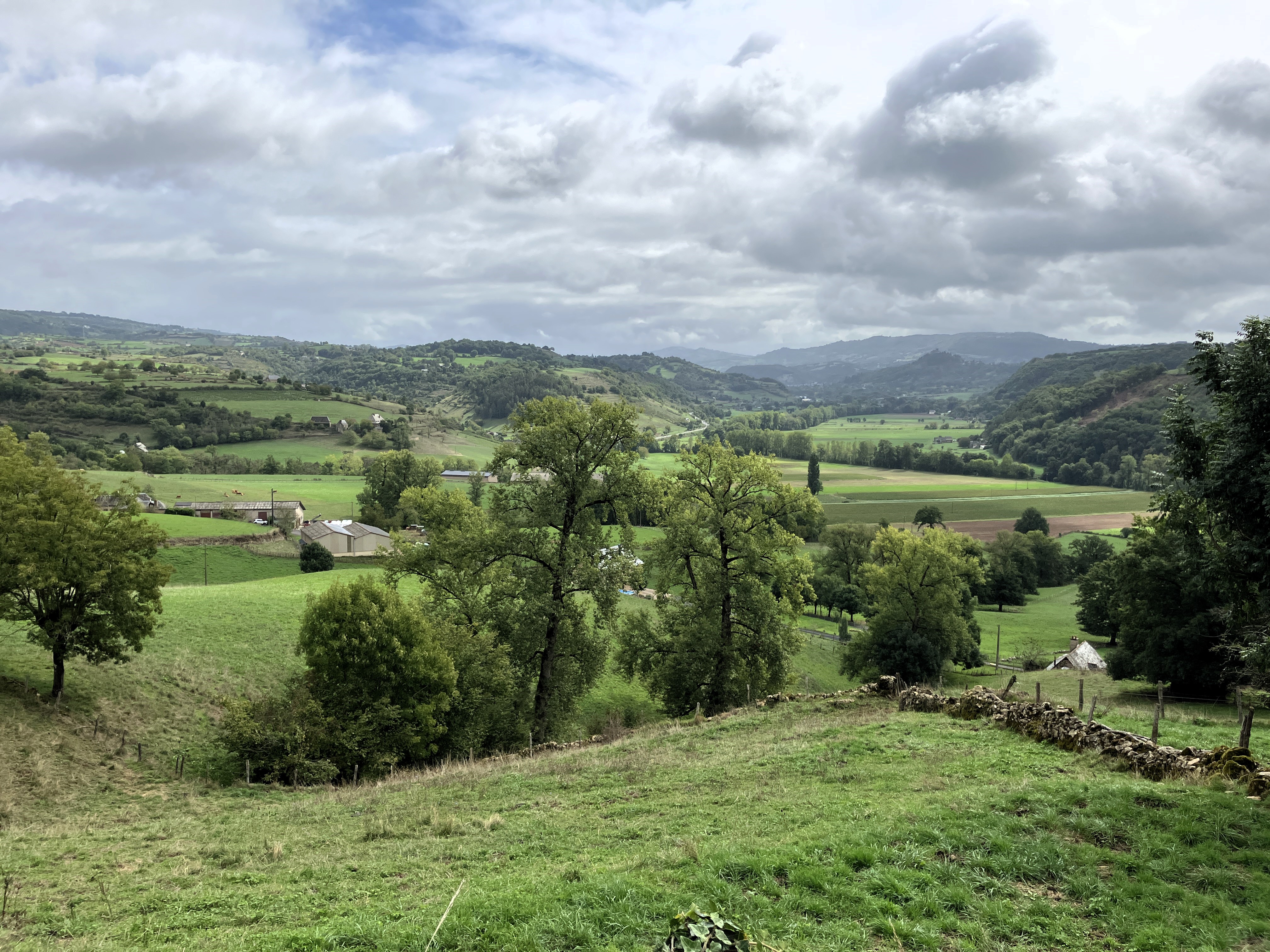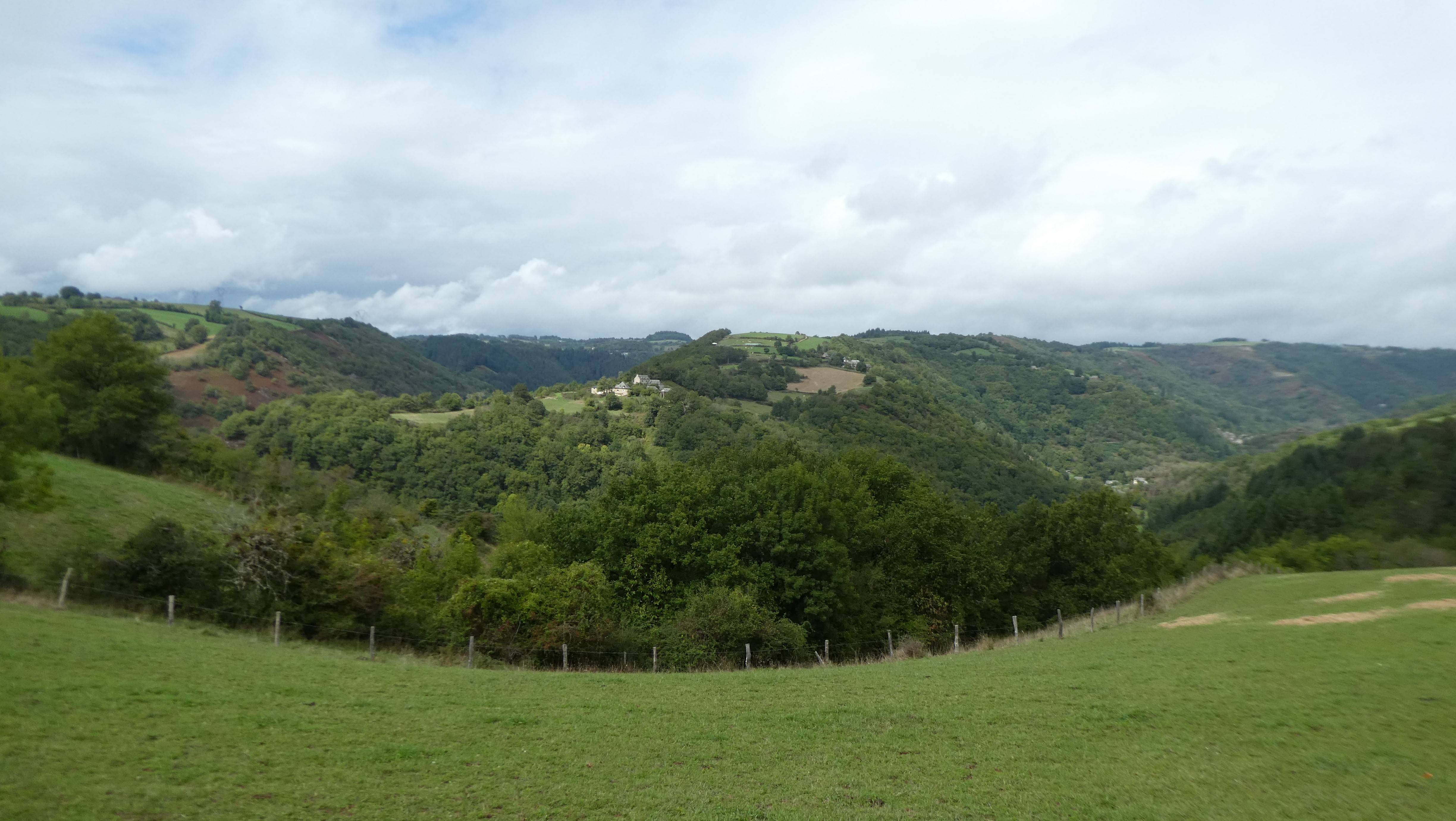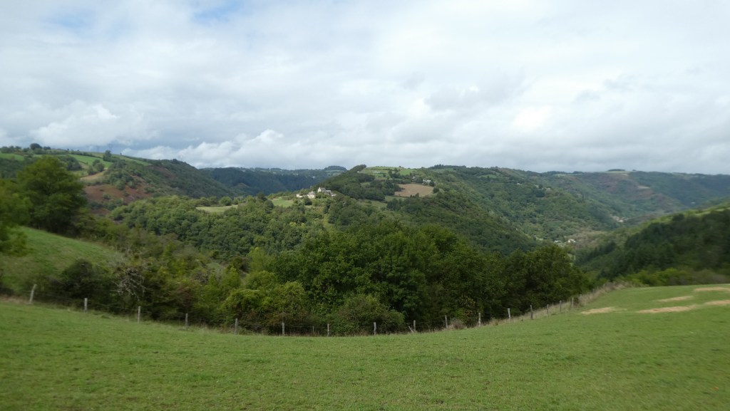 We got up and had left by eight using the back streets of Estaing to avoid the barriers still up from the festival. We also managed to pick up some croissants from the boulangerie which we ate with coffee on the D22 near Villecomtal.