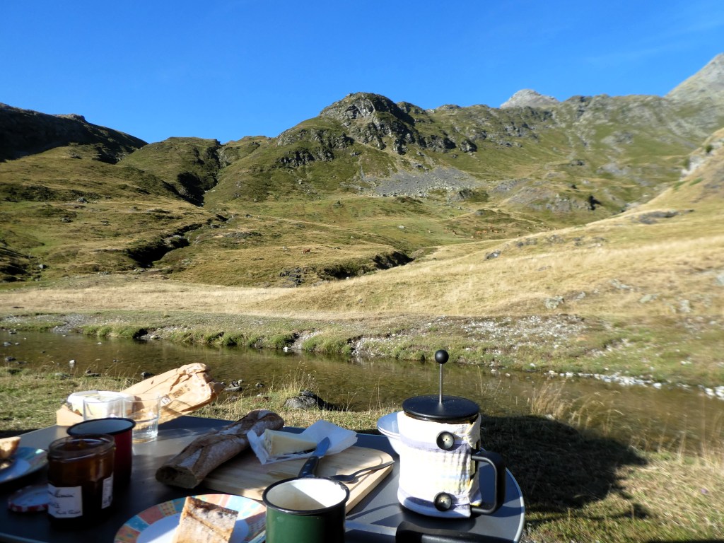 It was quite intimidating as one started nosing our breakfast. Luckily at this point the farmer arrived with his dog to send them back over the river where the dog drove them up into the mountains to graze.