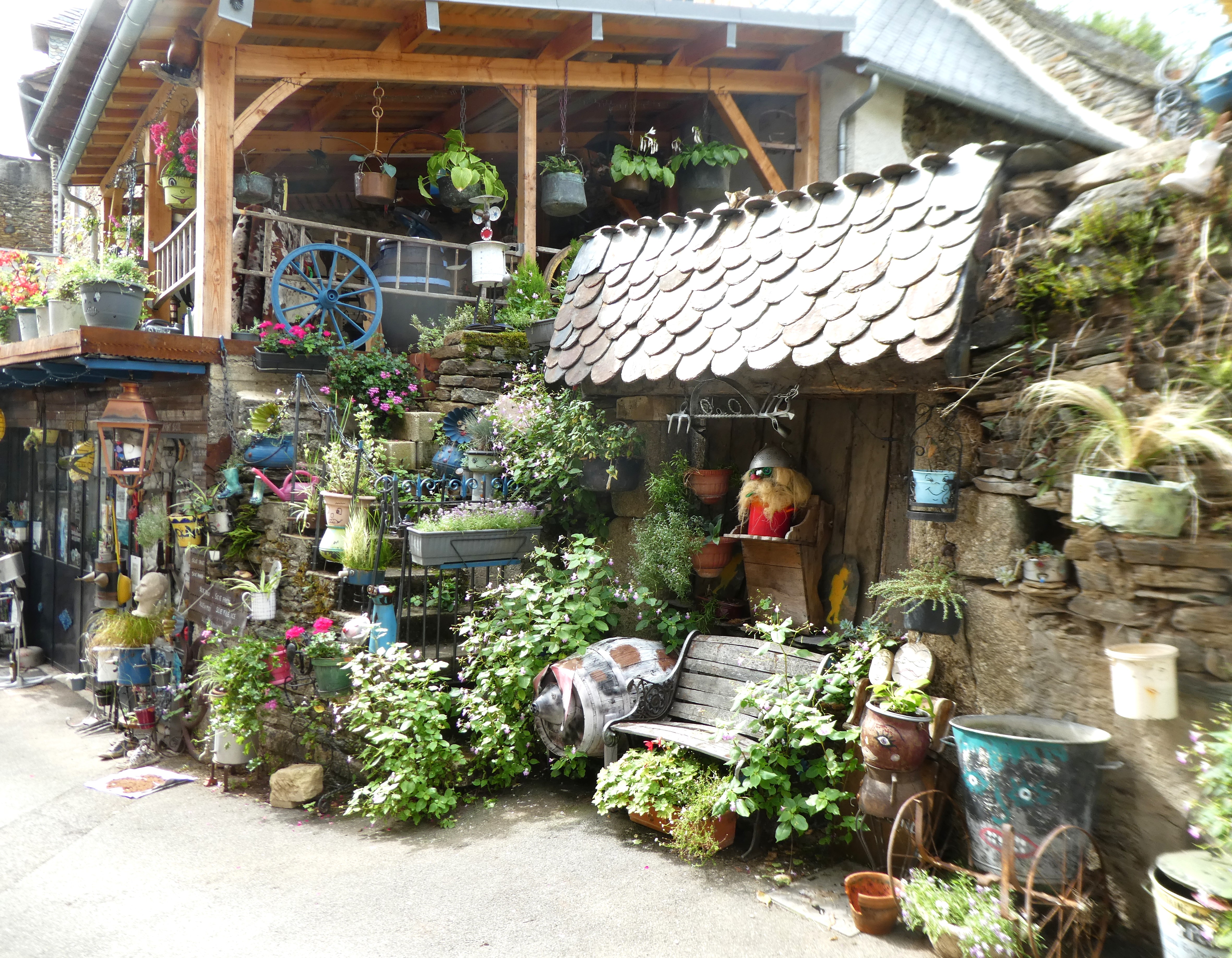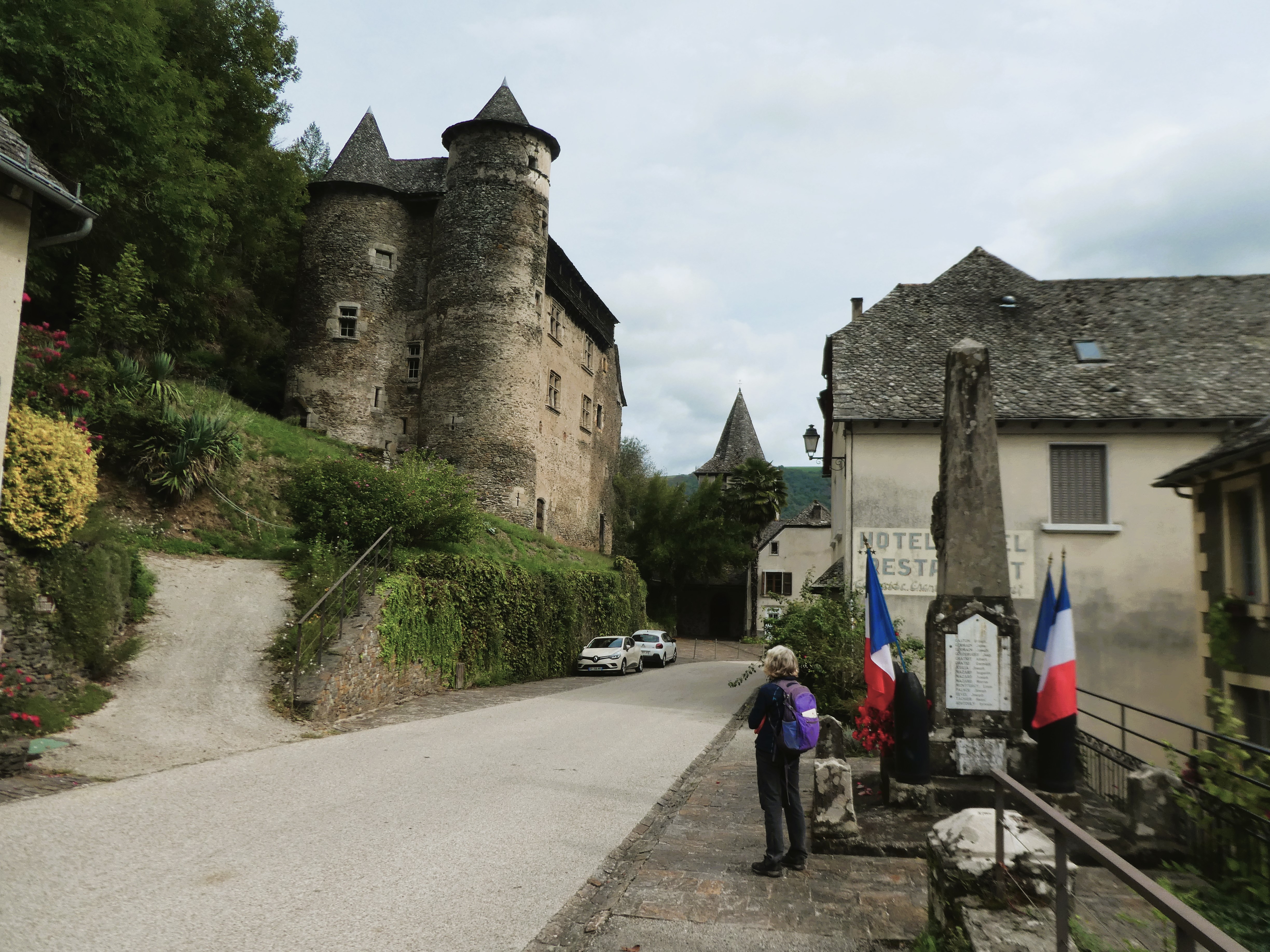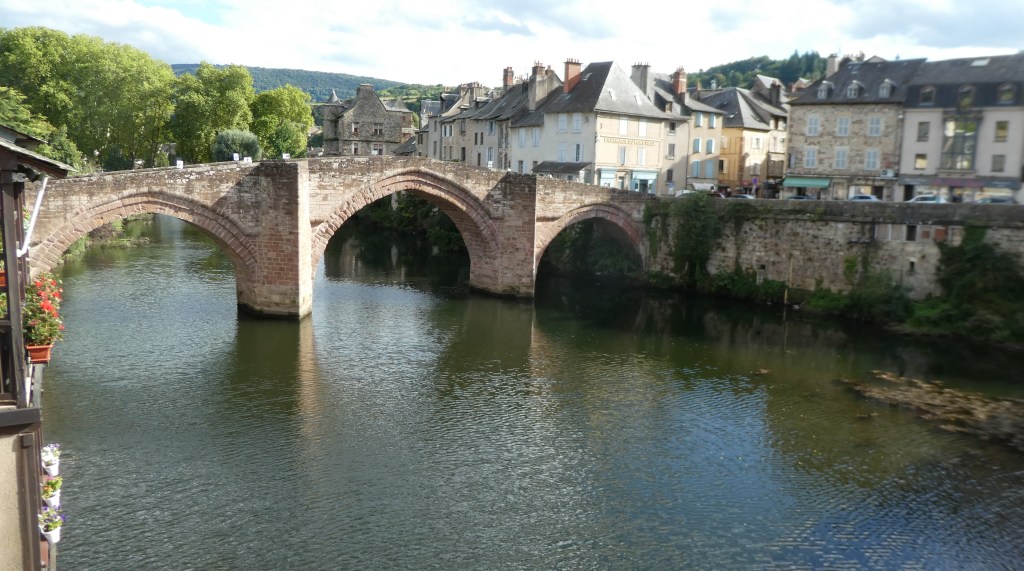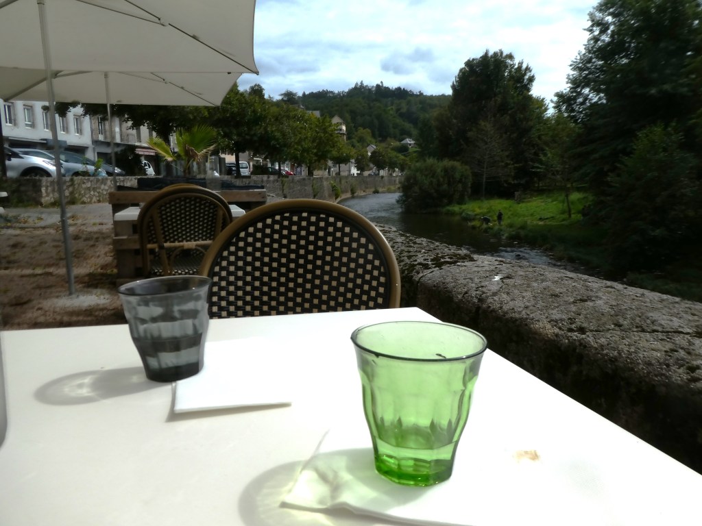 At Vieillevie we sat on the shady terrace of a Hotel de la Terrasse although shade was not what we were looking for on this rather cool day. We had a pot of afternoon tea and decided, because the bike batteries were quite low, to return via Entraygues-sur-Truyere on the main road to avoid the steeper hills around Conques.