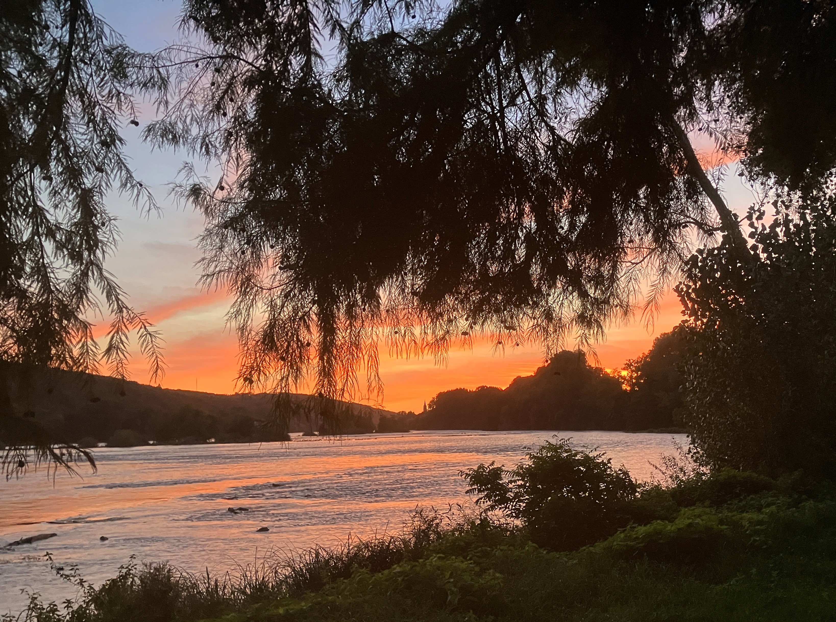 On our table by the river, we had a much-needed beer and food watching a kingfisher fly across the river and the egrets and cormorants return to their trees just as the sun set brilliantly and the bats arrived.