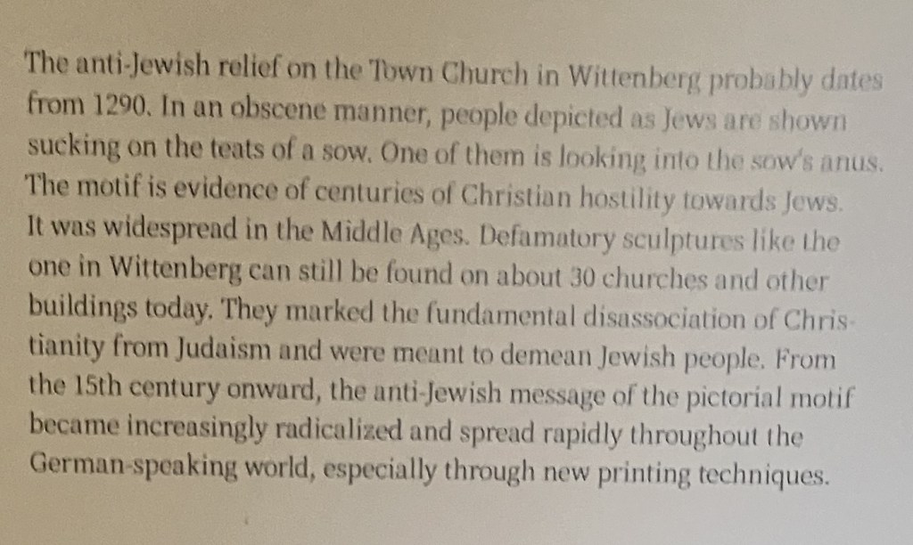 The portrayal of the Jews suckling on pigs as a relief on the walls of churches was a result of the expression of his views. We had previously found such relief on the walls of the Church in Regensburg. (Our Balkan Trip 2023)