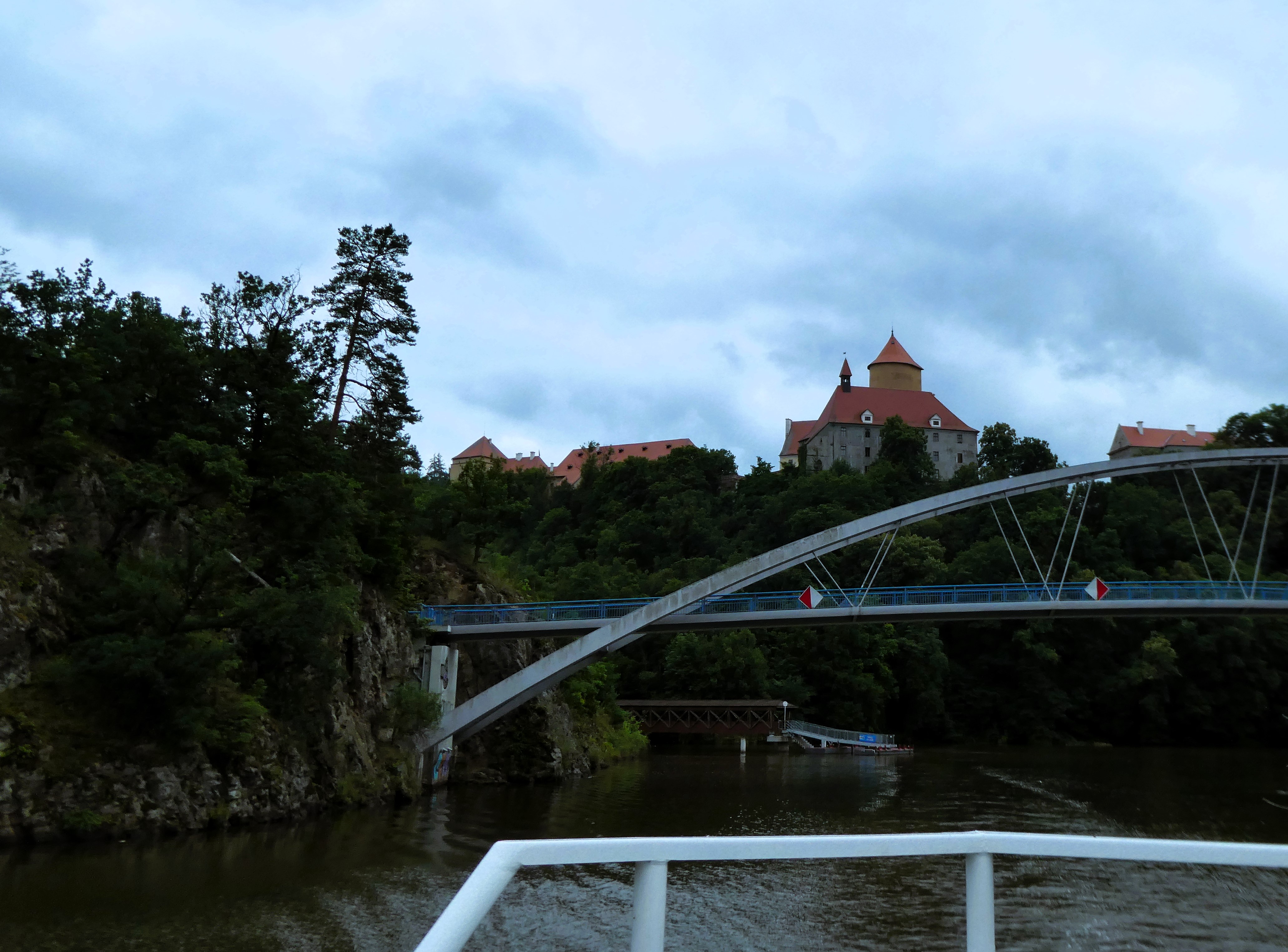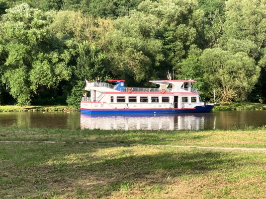 He tells us that there is a ferry boat that operates nearby on the dammed River Svratka. It goes as far as the outskirts of Brno and and there is a stop Cyklisticka by a cycle track that leads into Brno. We go down to the river and see the ferry boat and feel very positive about tomorrow. We have travelled 1400 miles so far.