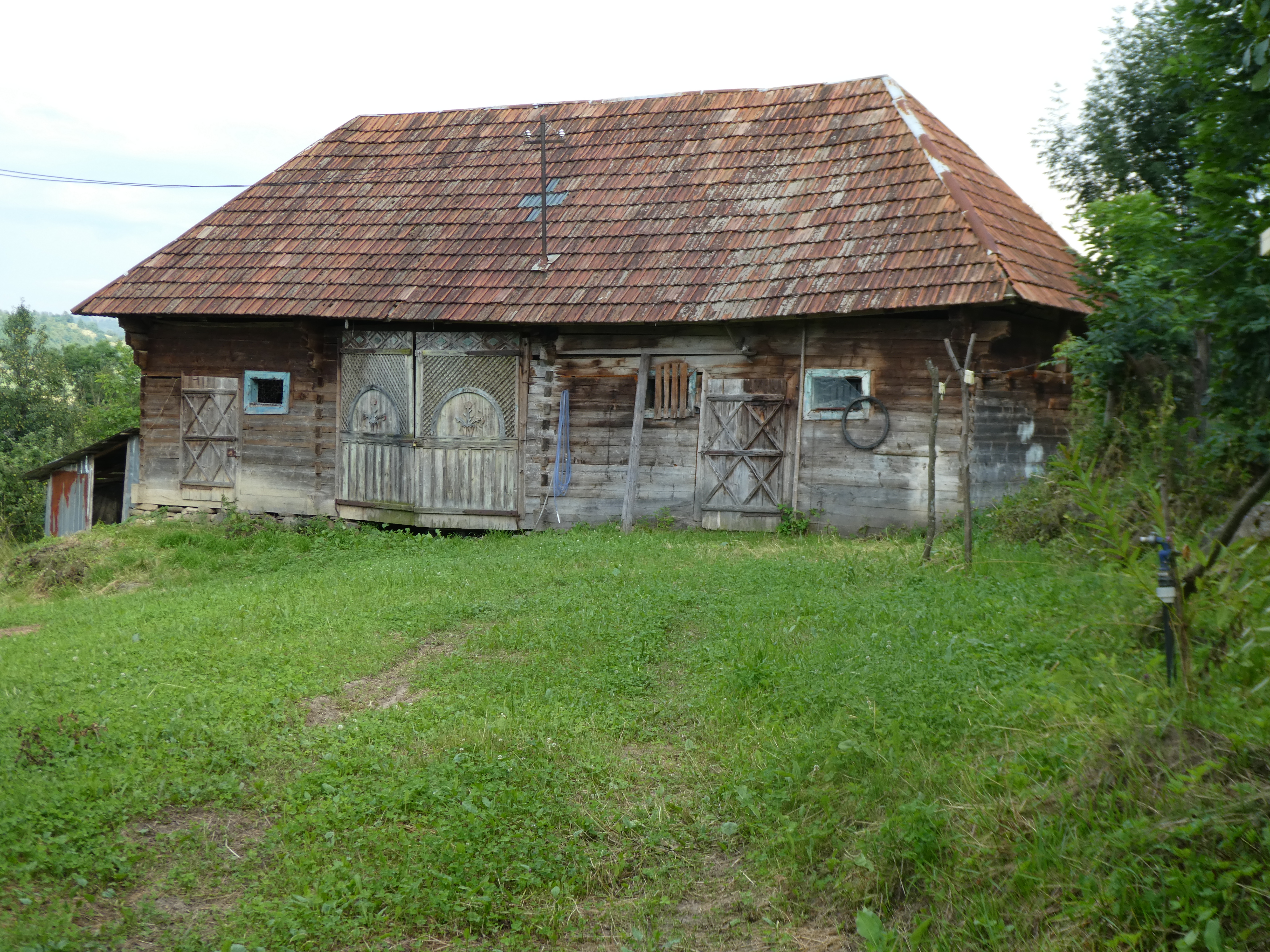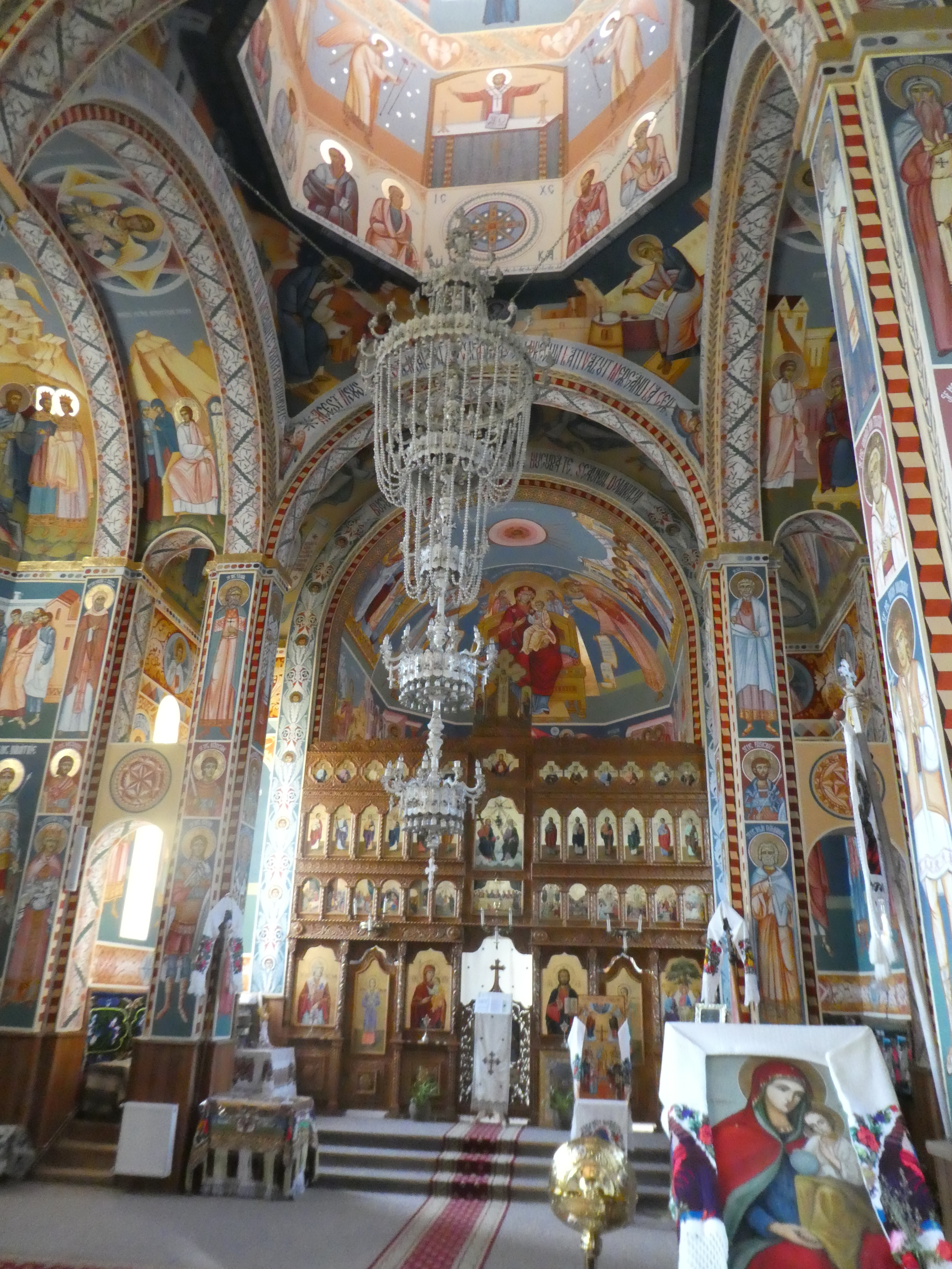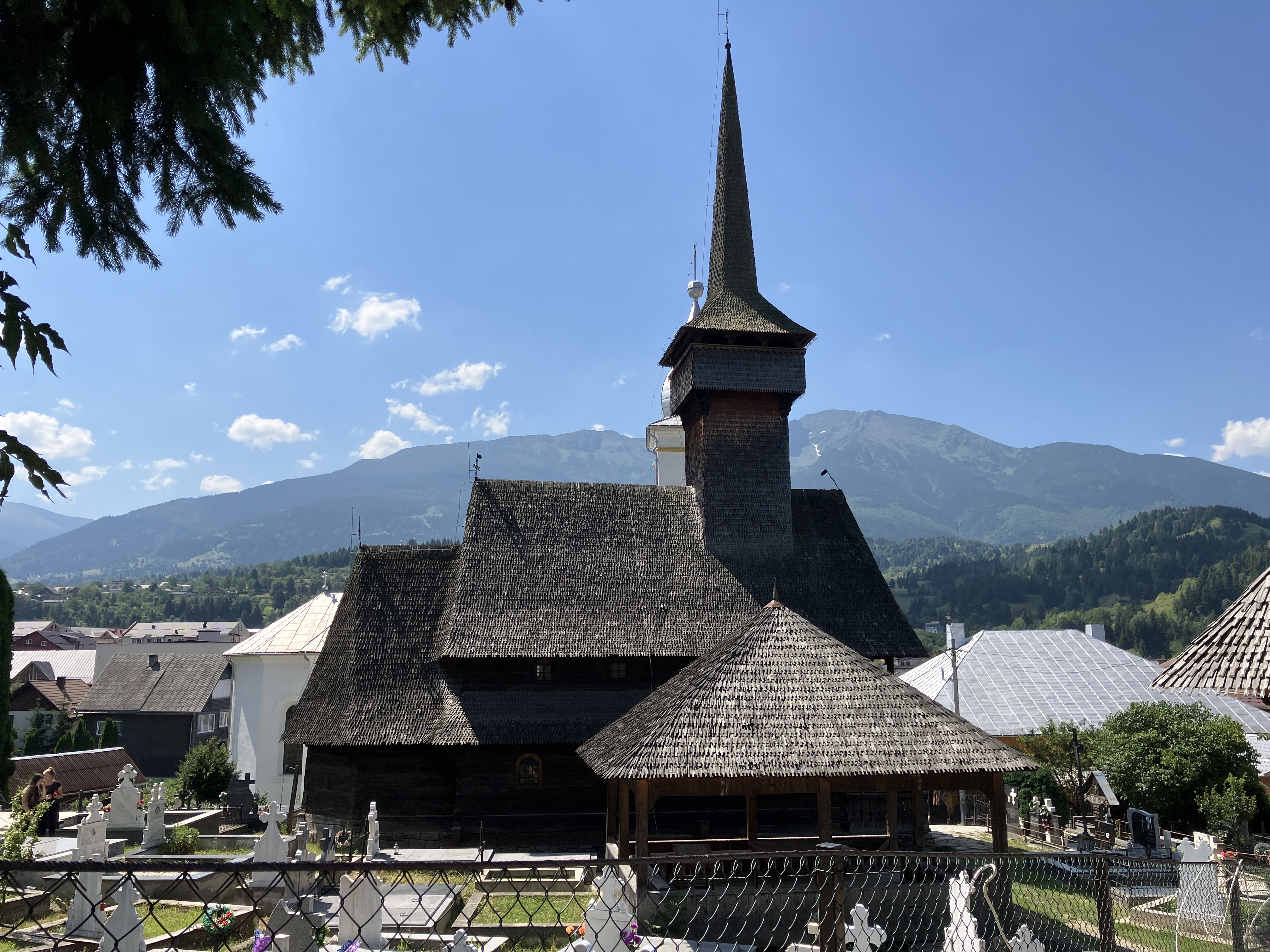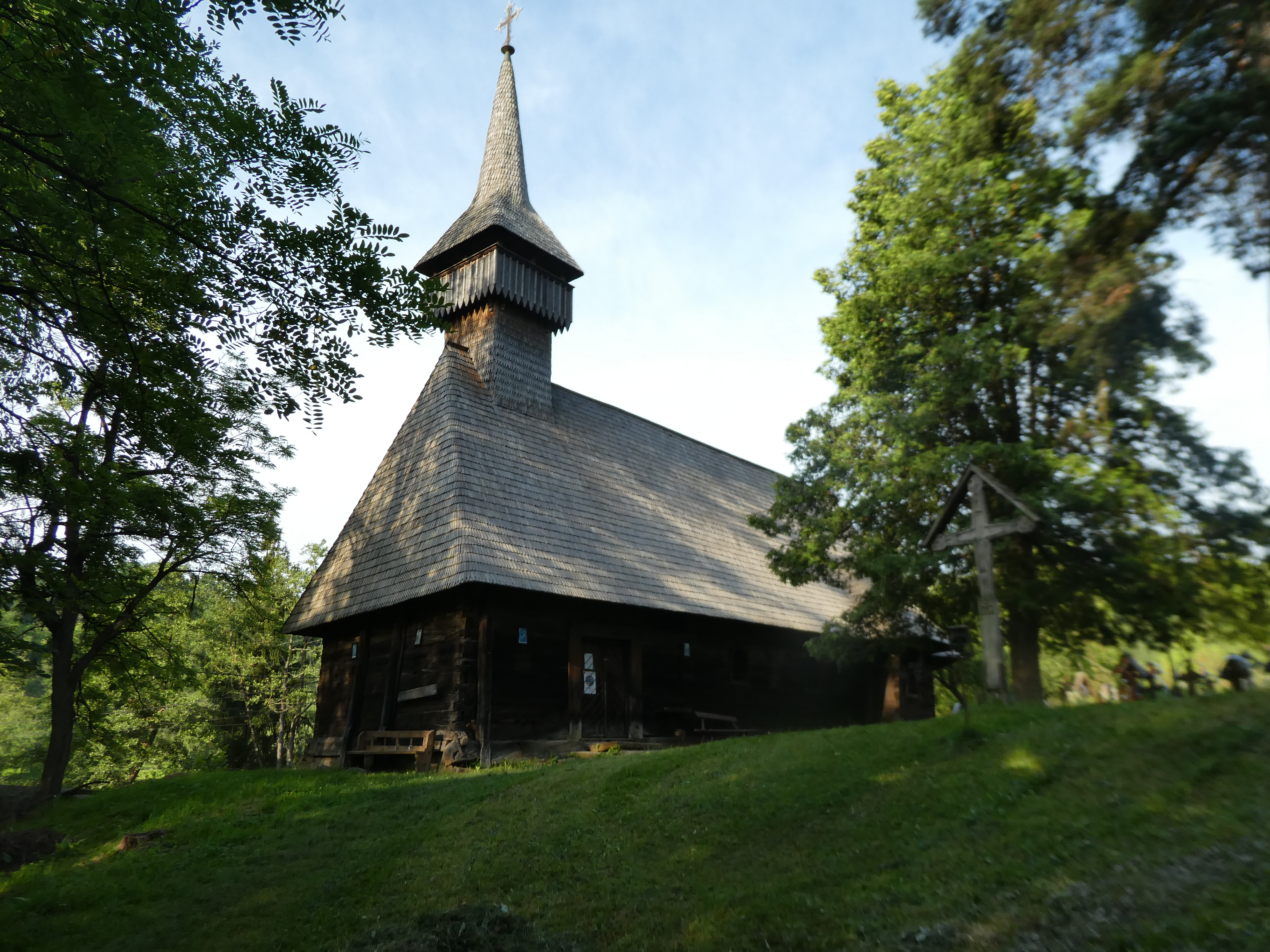 We tried to see inside the new and old wooden churches but they were locked, the enormous stone and zinc church was open and with the walls all painted colourfully and just benches covered in rustic blankets all around. In the church was a book in Romanian and English written by children from the local school about their village. We didn’t have the change to buy it but were determined to come back and get a copy the next day.