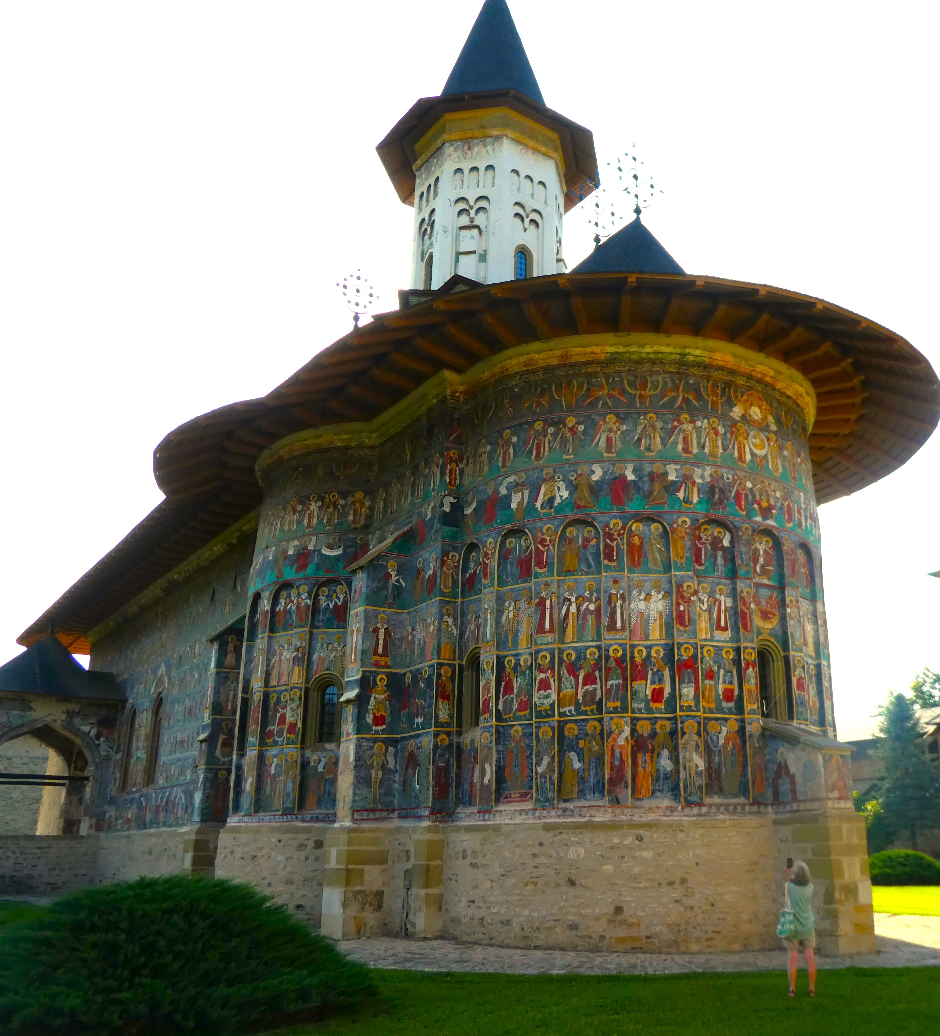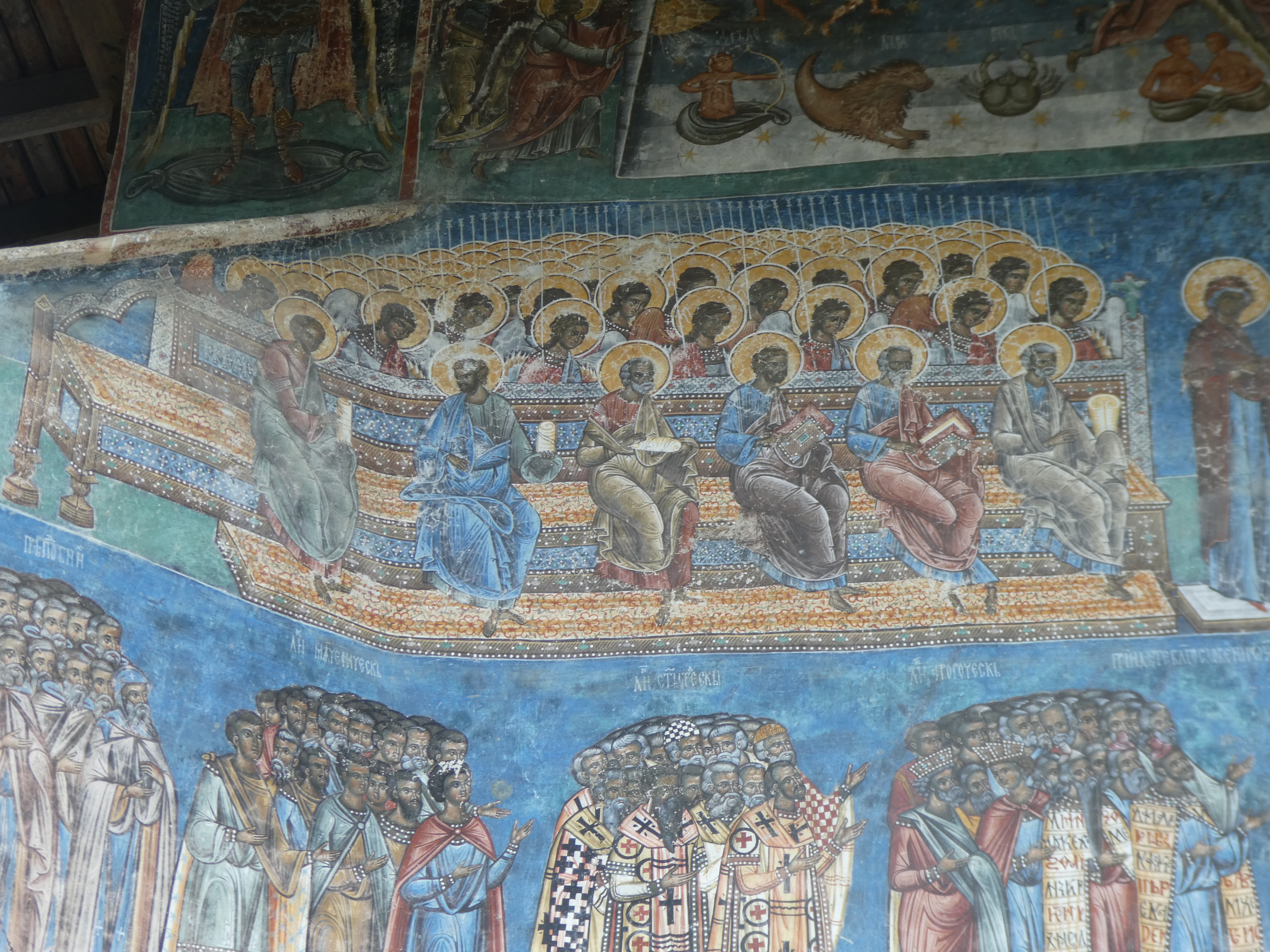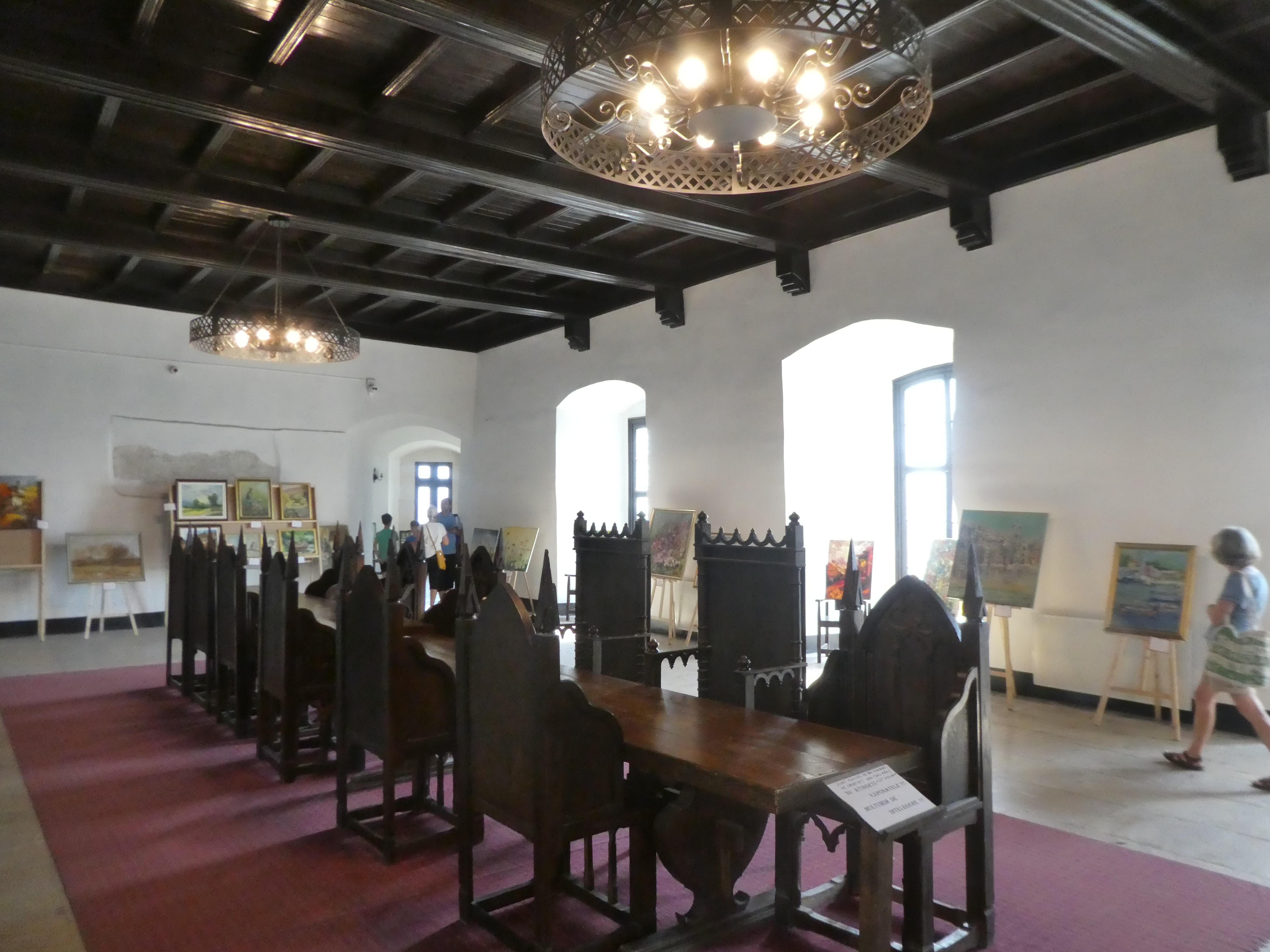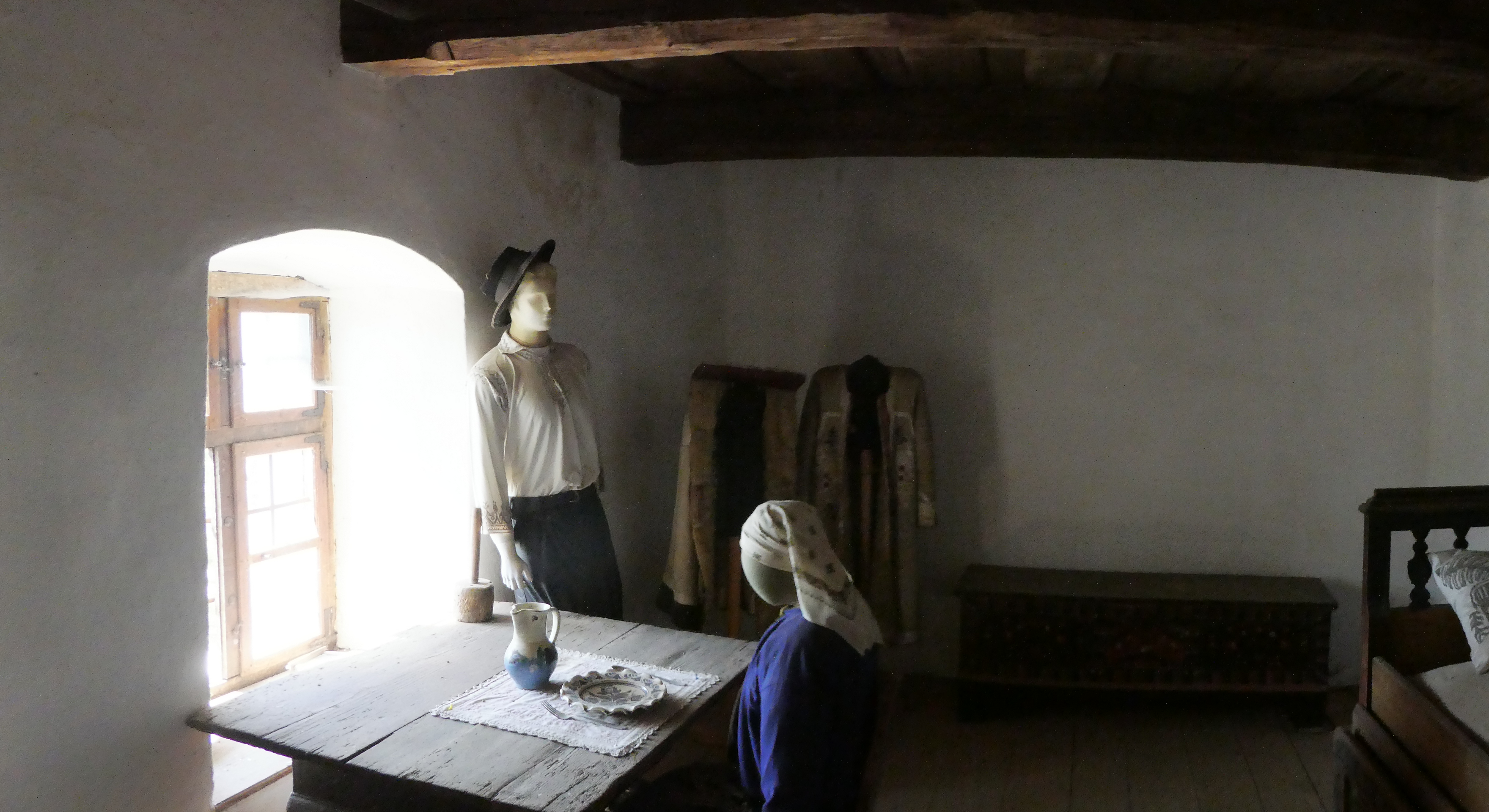 We tried to see inside the new and old wooden churches but they were locked, the enormous stone and zinc church was open and with the walls all painted colourfully and just benches covered in rustic blankets all around. In the church was a book in Romanian and English written by children from the local school about their village. We didn’t have the change to buy it but were determined to come back and get a copy the next day.