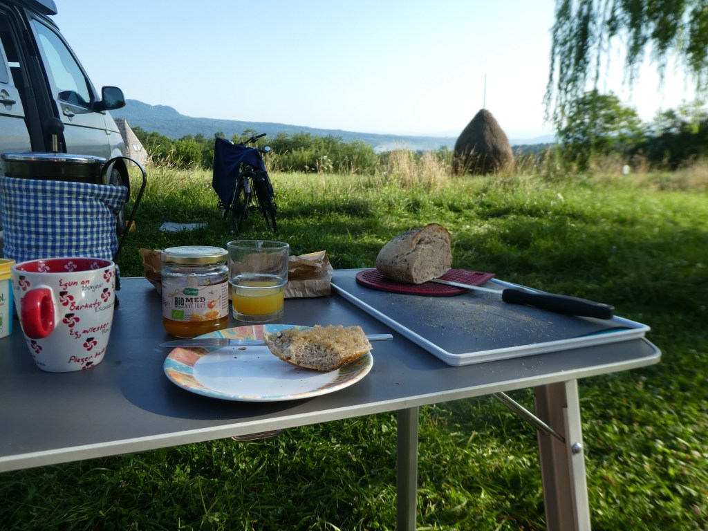 The owner brought us a newly baked loaf of bread in time for breakfast which we savoured as it was hot. There was enough left over to make sandwiches for lunch, quite solid but ok.