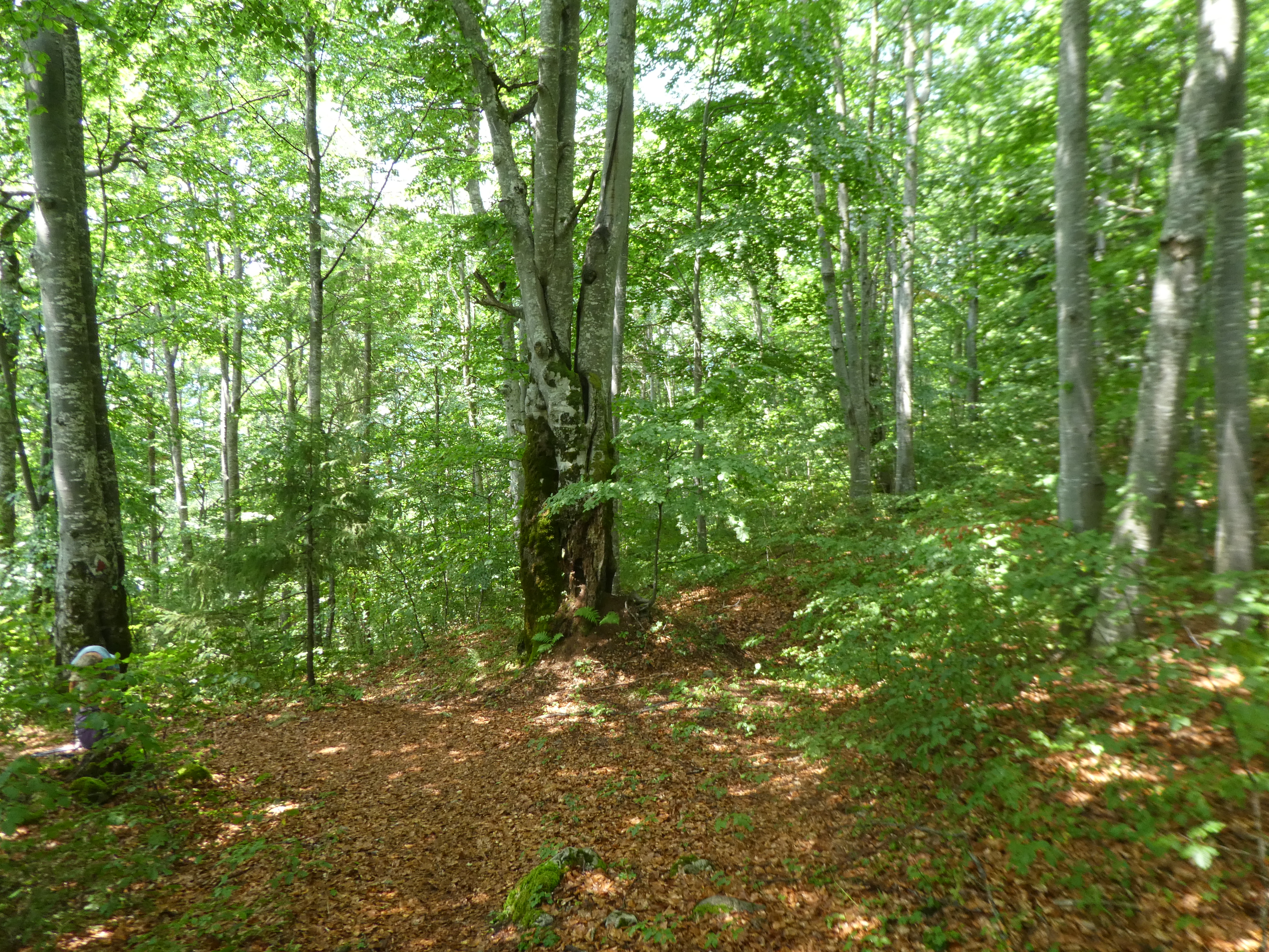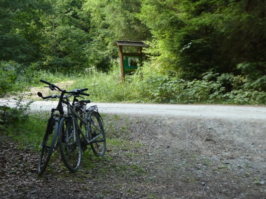 We cycled down the road taking a left turn up into a busier part of the forest, left our bikes and climbed a well used path up through some wonderfully mature and spacious woodland to Trei Brazi, a popular bar restaurant where we had a drink.