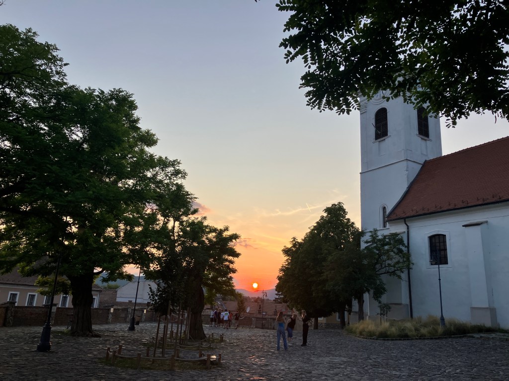 The town was buzzing with people wandering around, eating in the cafes sitting out on the street. . We bought ice creams and wandered too and found ourselves sitting beside the river then up to the church at the top of the town in the churchyard as the sun set.
