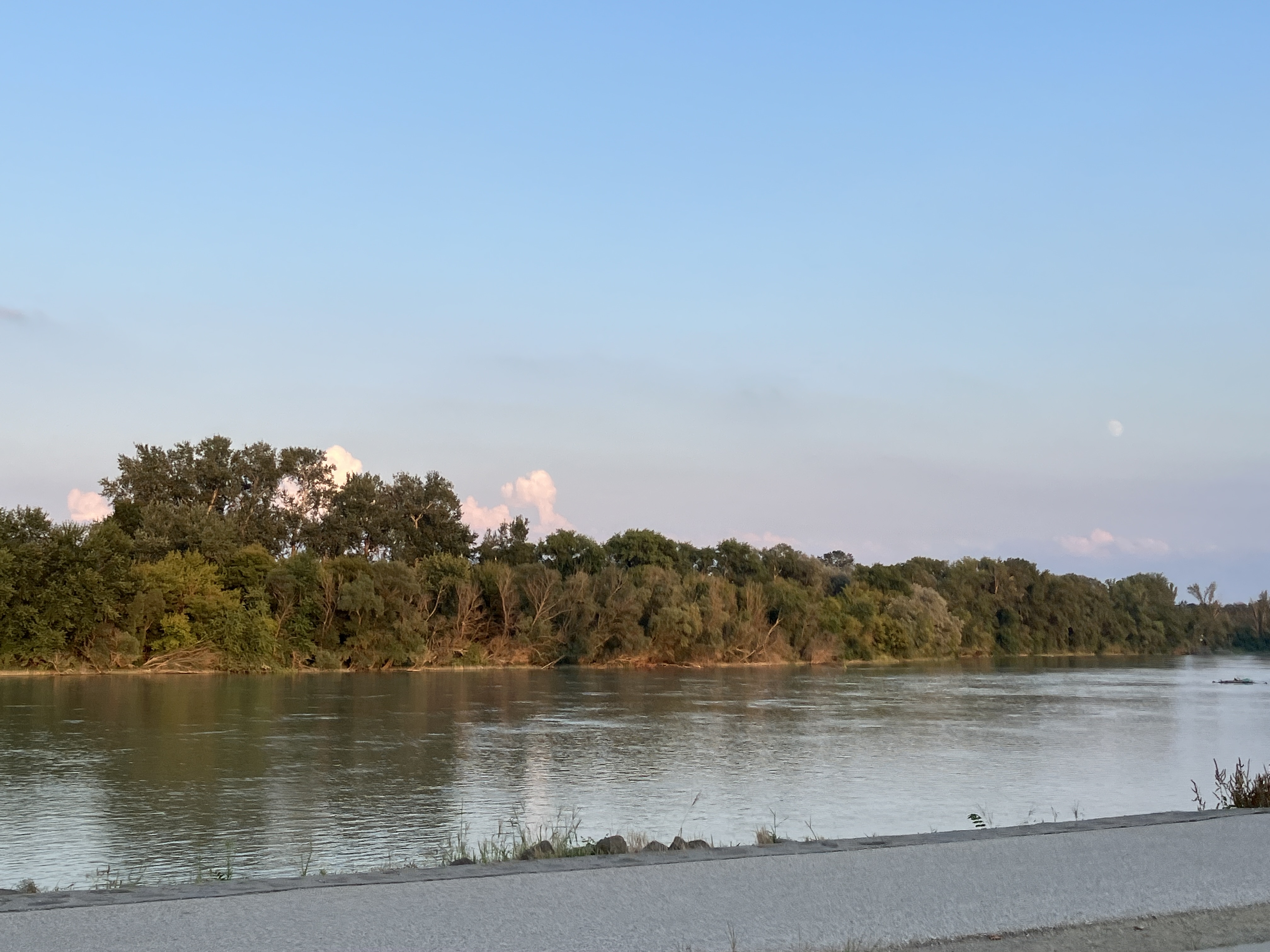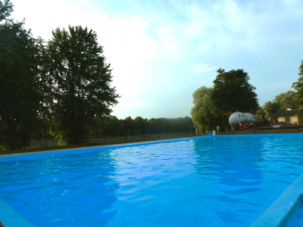 After much messing about, initially camping alongside a motorhome that had air conditioning running 24/7. we eventually we found a less busy plot and swam in the infinity pool overlooking the wide muddy Danube River.