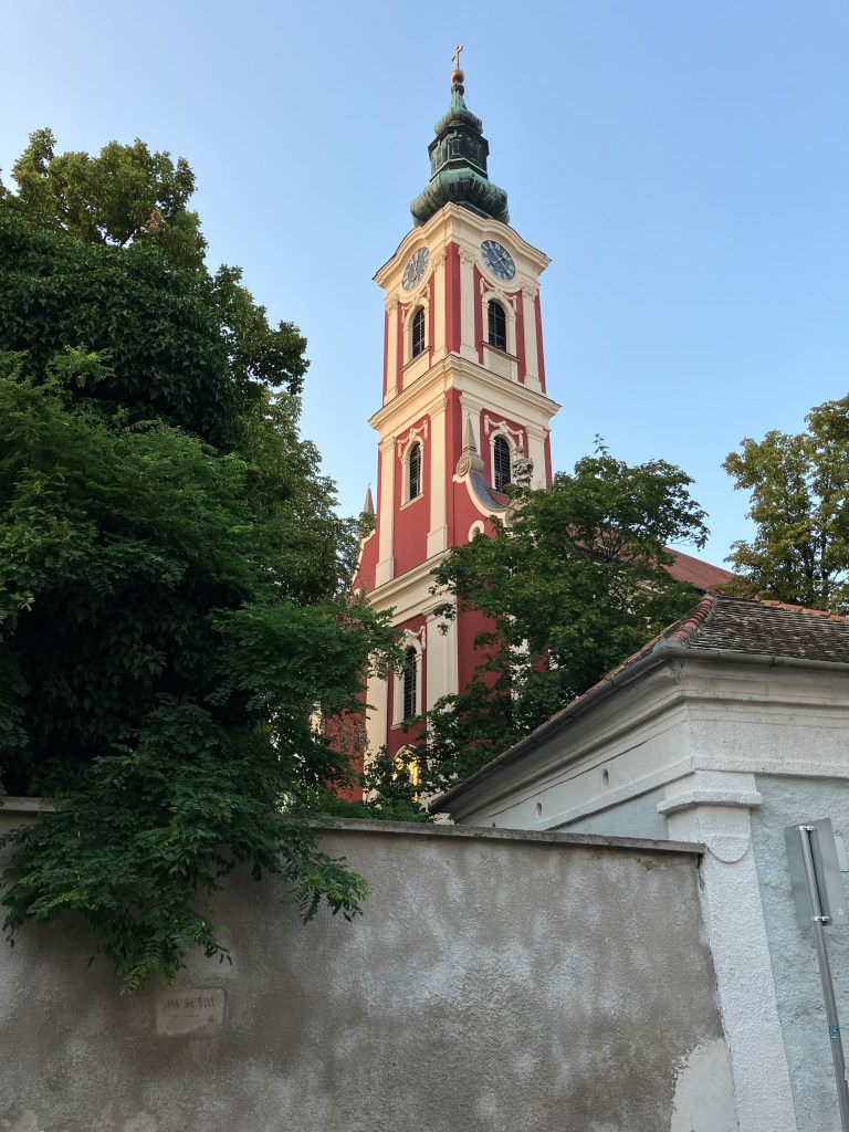 We cycled for ten minutes down a cycle track by the river into the in trendy artistic suburb of Szentendre where we had a meal at Dorothea’s which was nice, but the court yard we chose to eat in was warm, so we didn’t linger.