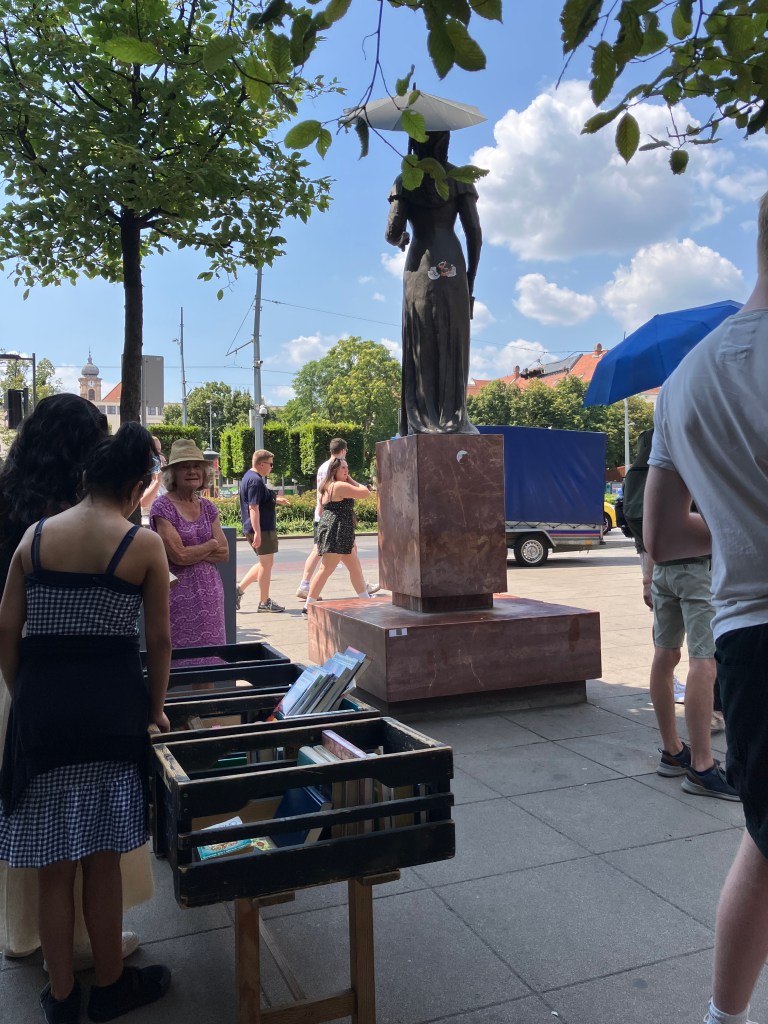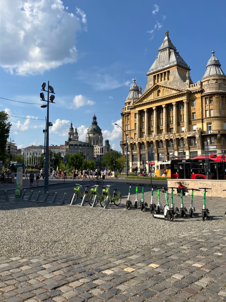 It was so hot, well into the thirties, that we tried to keep in the shade as we headed for the Jewish quarter and found a bar where we devoured a selection of dips and pitta bread, which was lovely, washed down with very cold Hungarian Rose. Feeling refreshed, we collected our bikes and started to cycle to Liberty Square to make our way to Heroes Square.
