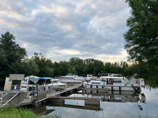 The day starts cloudy with heavy rain. As we pack up large barges come down the river past the site. We are on our way by nine and heading south and west not using the autoroutes.