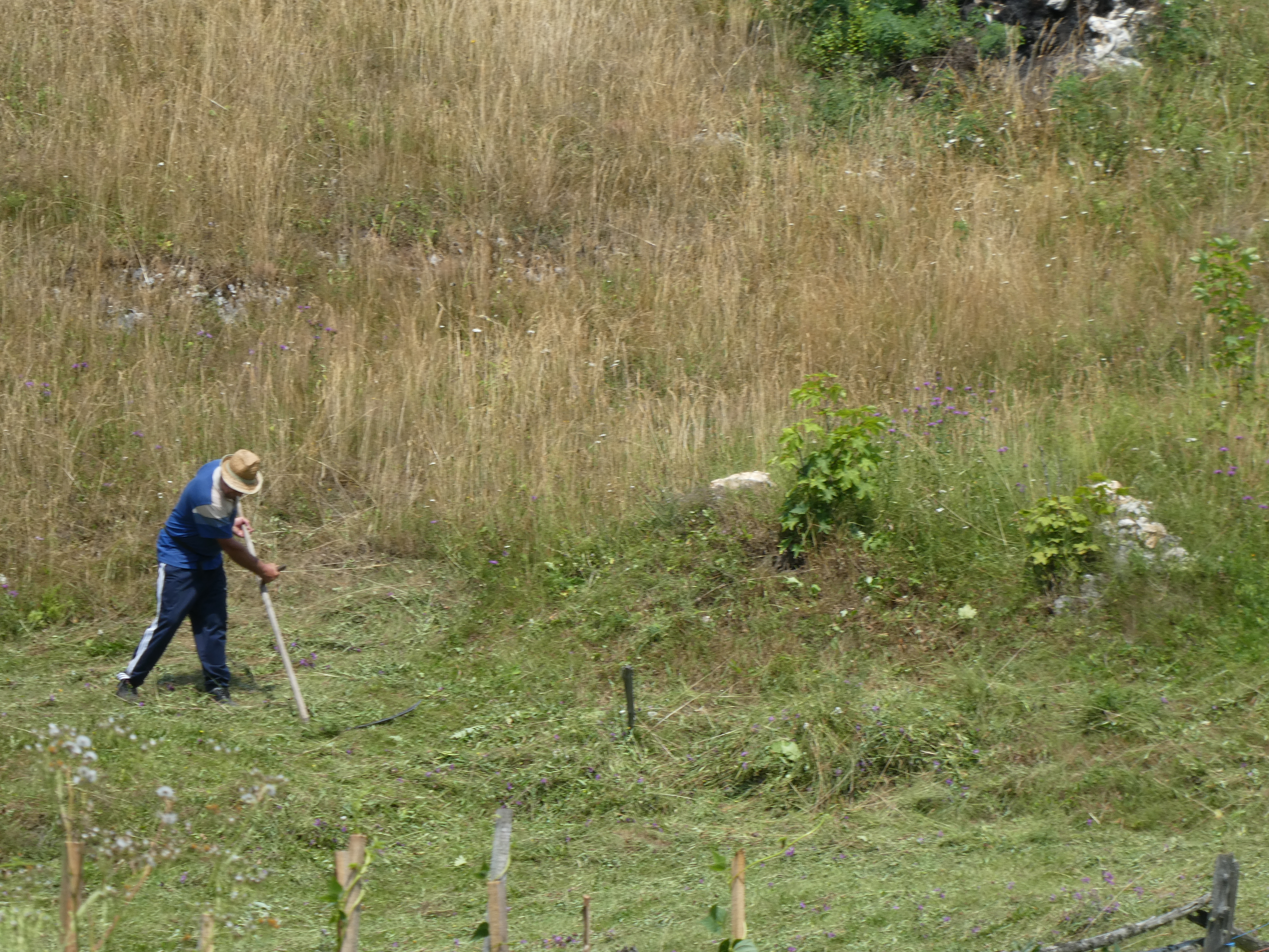 We did a wash before cycling down to the village and up a valley where we leave our bikes at the first junction by a bridge. We follow a path, that we had found on Google maps, up through woods and fields, to a road which we walk along admiring the high views we were having of the surrounding hills and of people cutting, raking and stooking the hay.