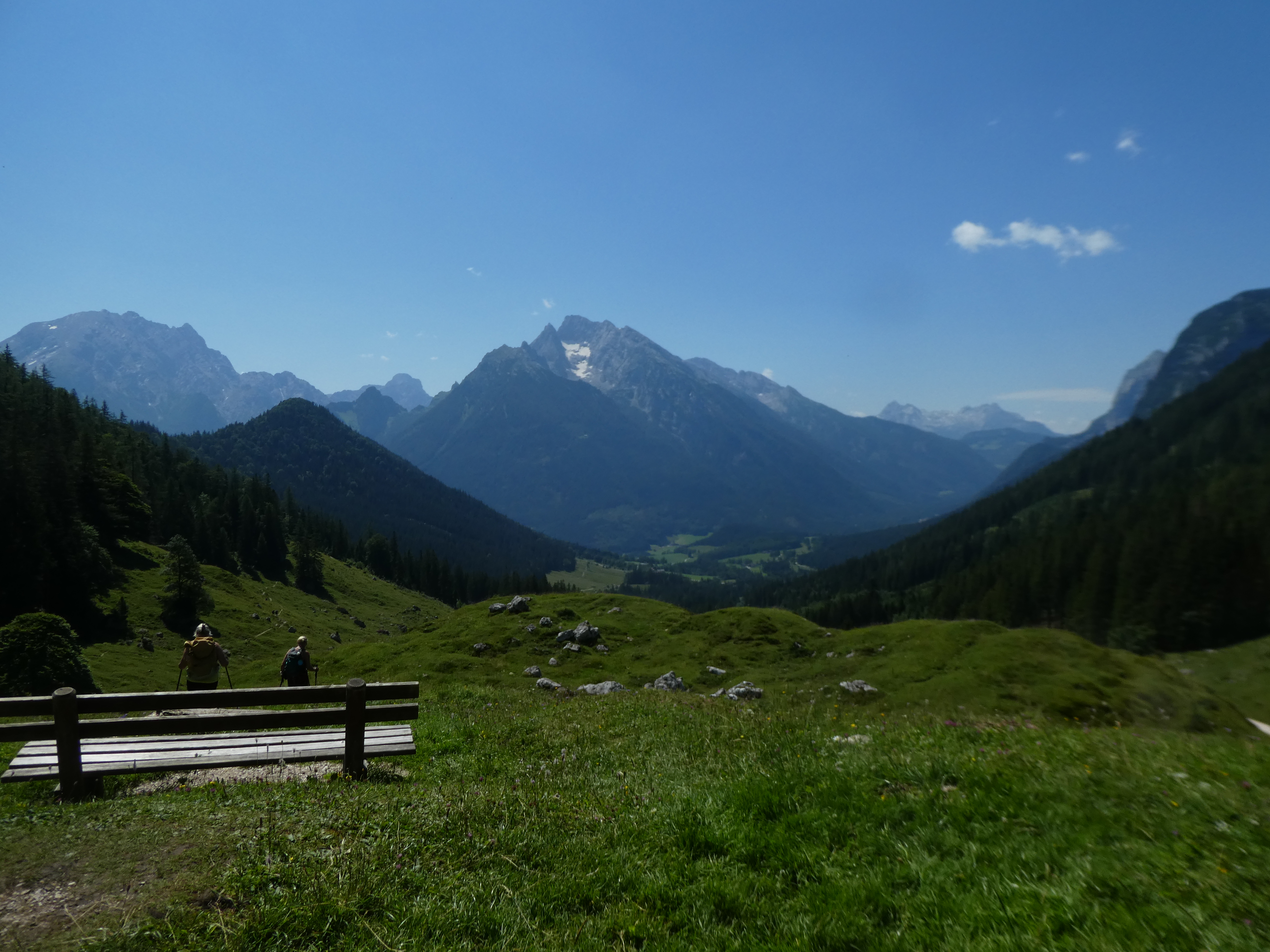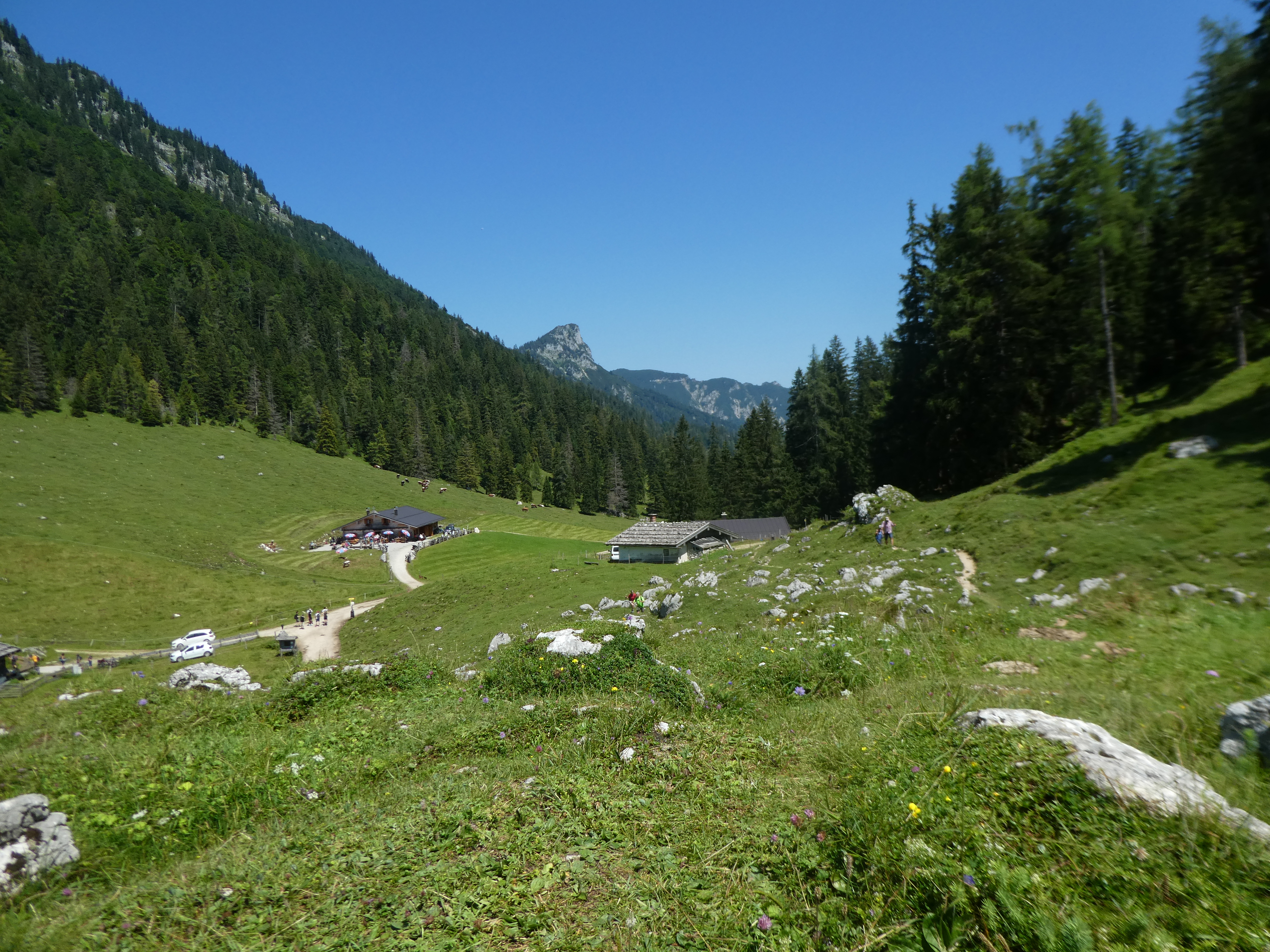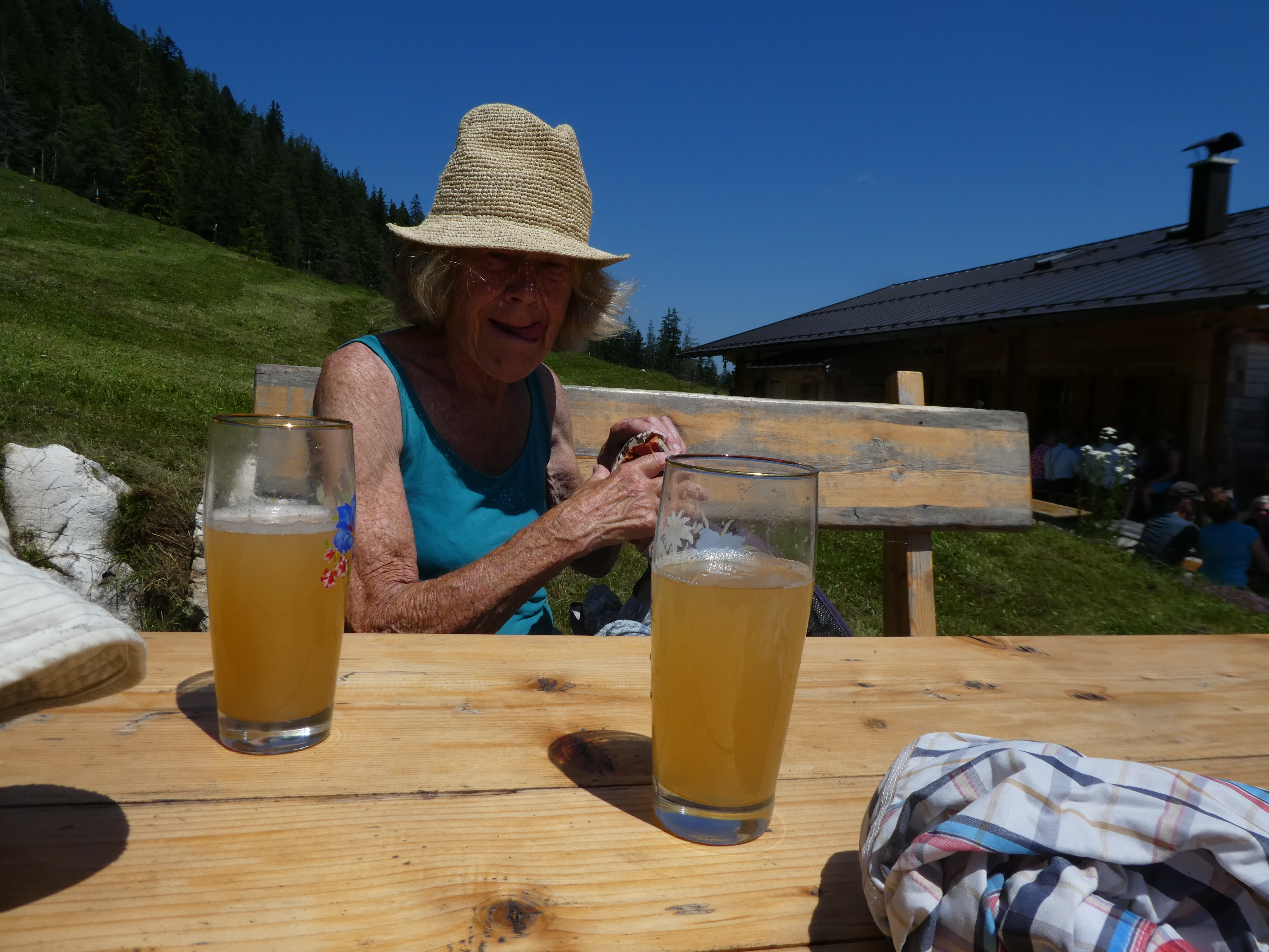 It was sunny and very hot. Graham didn’t feel quite right after a full day yesterday so we took it slowly and wandered through trees and wide tracks climbing quite steeply, passed by a fair a number of e bikes, up to the Mordaunt Alm at 1,258m.