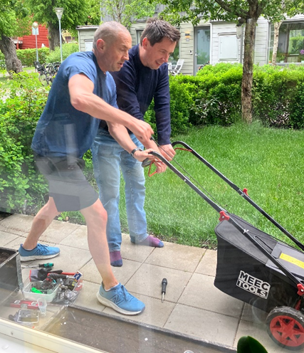 EvEveryone was up early. Peter had arrived and together he and Martin were trying to get a borrowed lawnmower to start. After much adjustment and consultation with on line instructions they got it going!