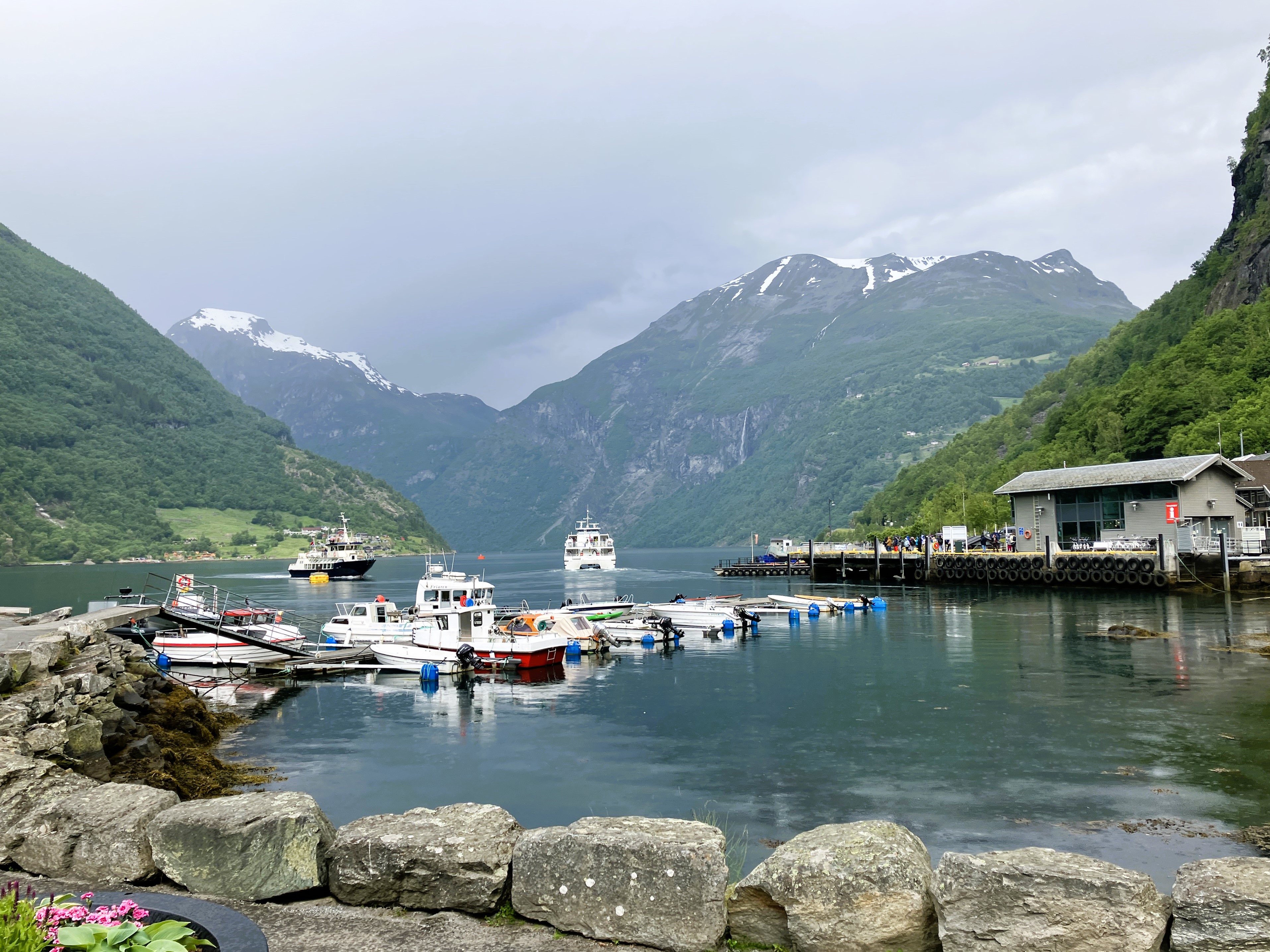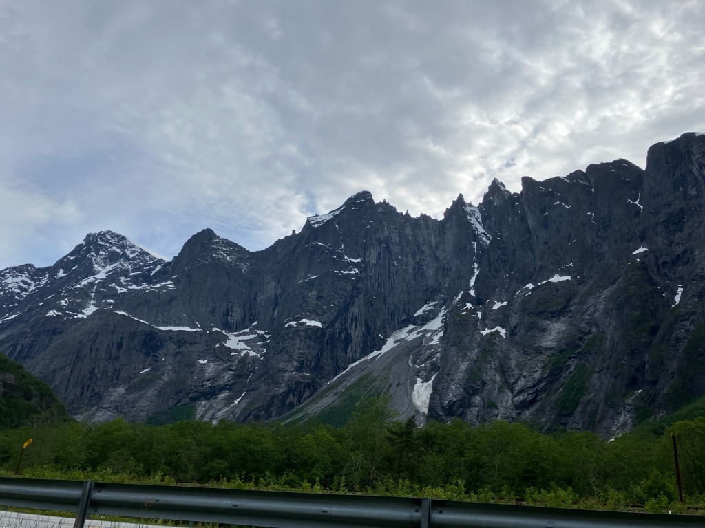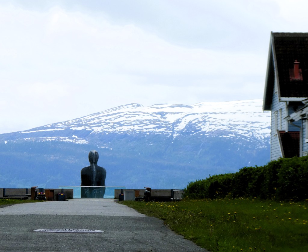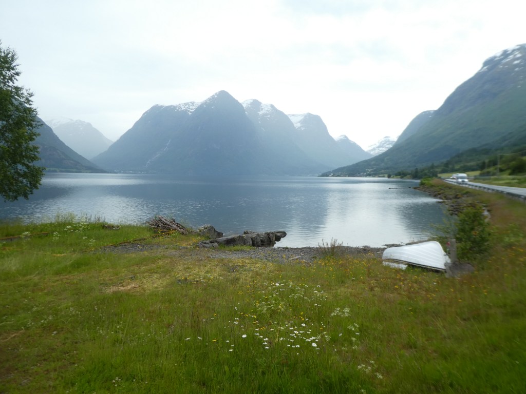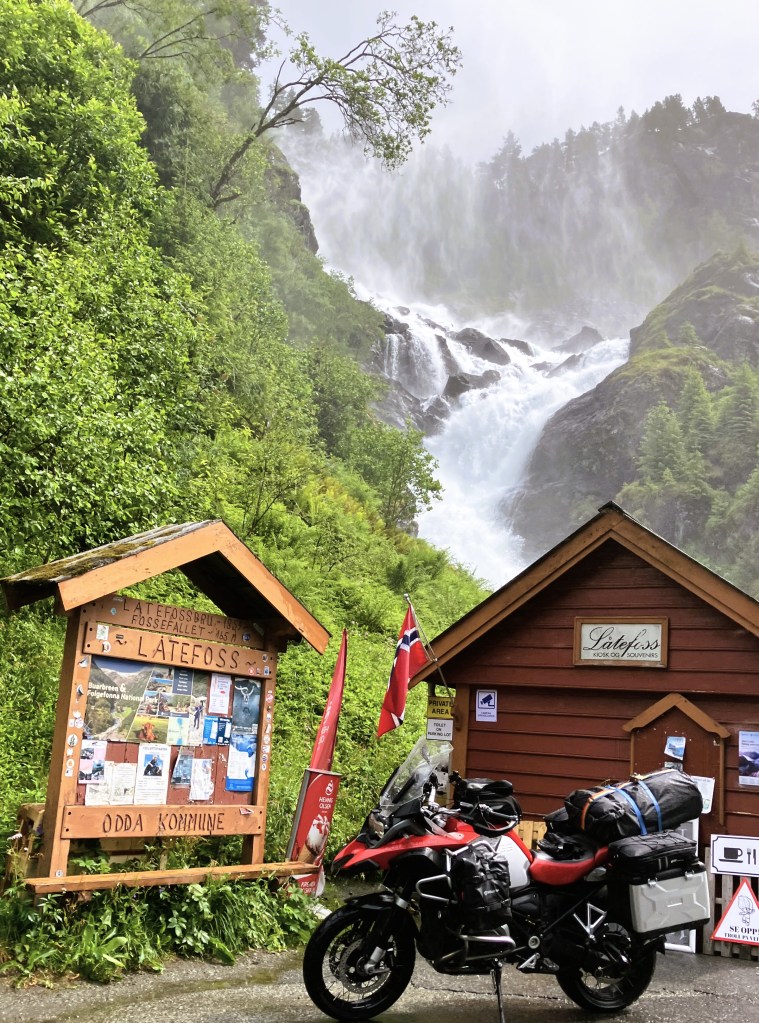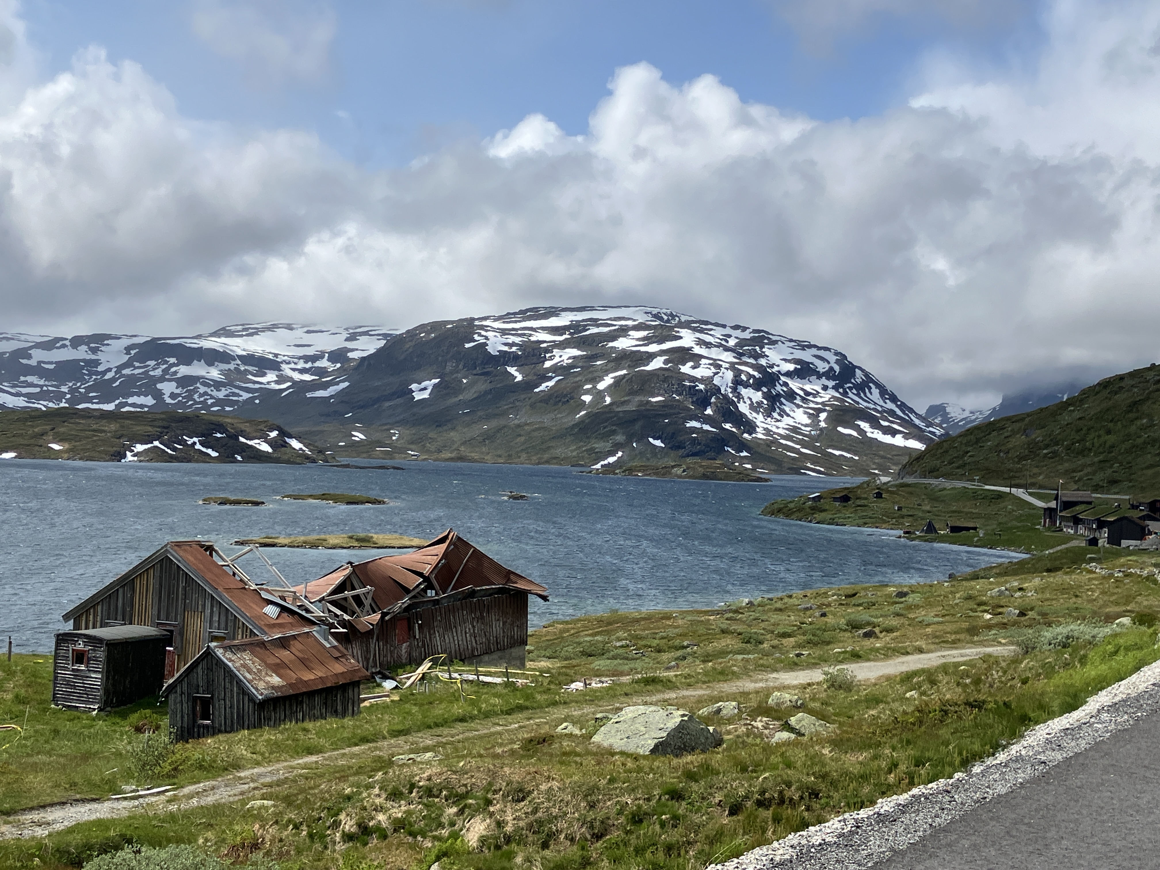 There were amazing waterfalls, and lots of lakes set amongst barren snowy mountain tops. The clouds were low and rain never far away as we stopped for Fika in Odda. As we had found before the recommended café was shut but we found a very acceptable alternative.