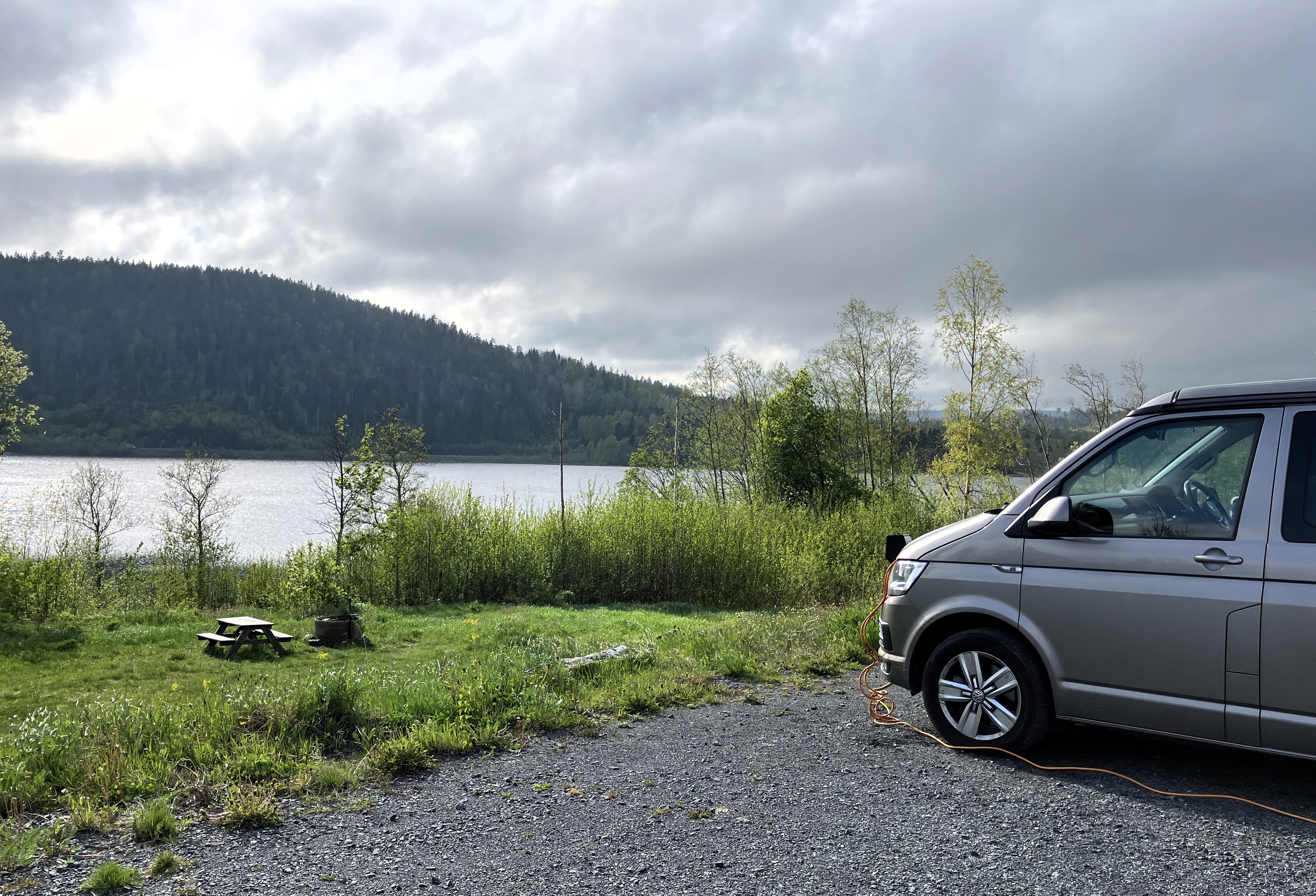 Lovely to wake and have breakfast looking over the peaceful lake. We charged up the electric bikes just on the inverter in the van. Great rejoicing!