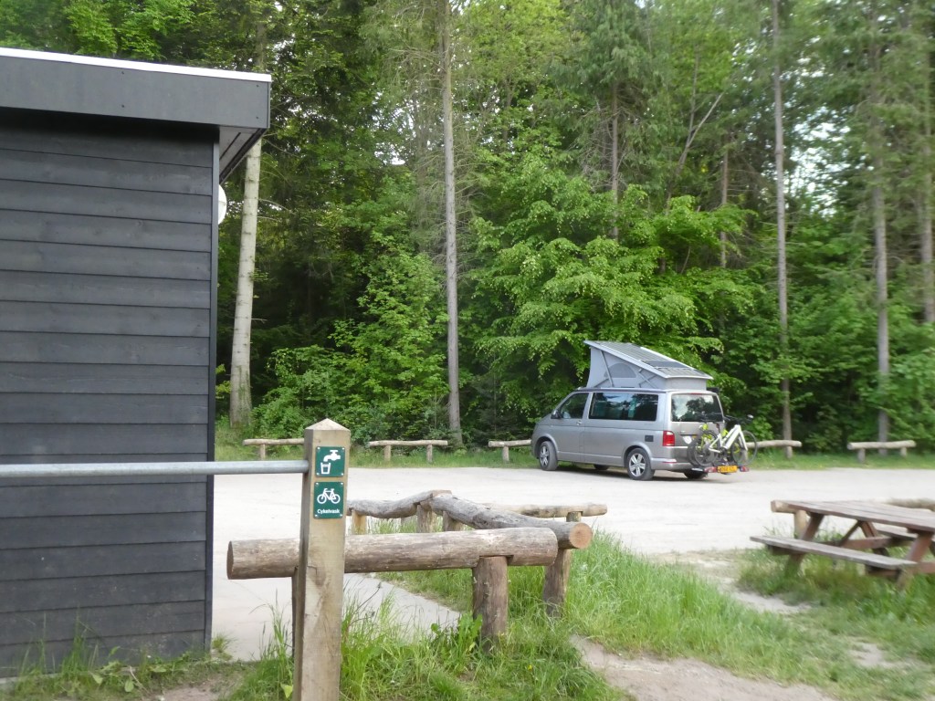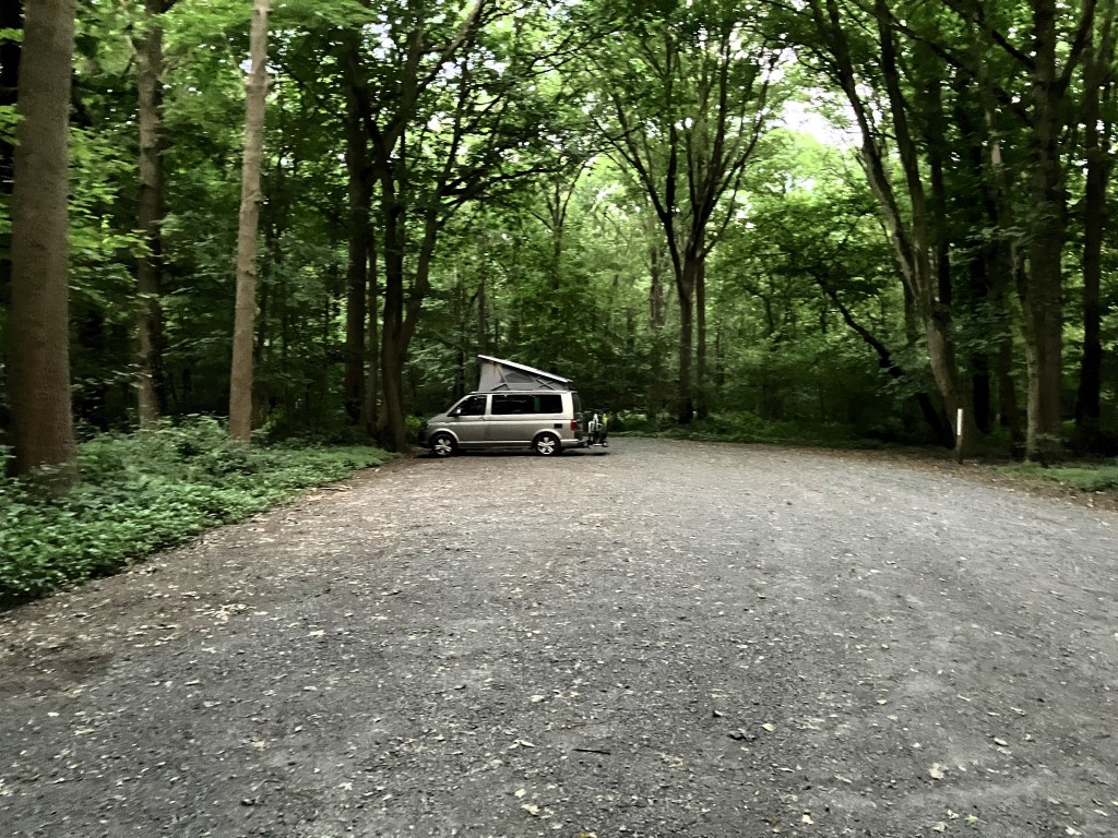 Our wooded car park camping spot was empty when we got there. We went to sleep with the front of the roof open looking through the trees to the moonlight.
