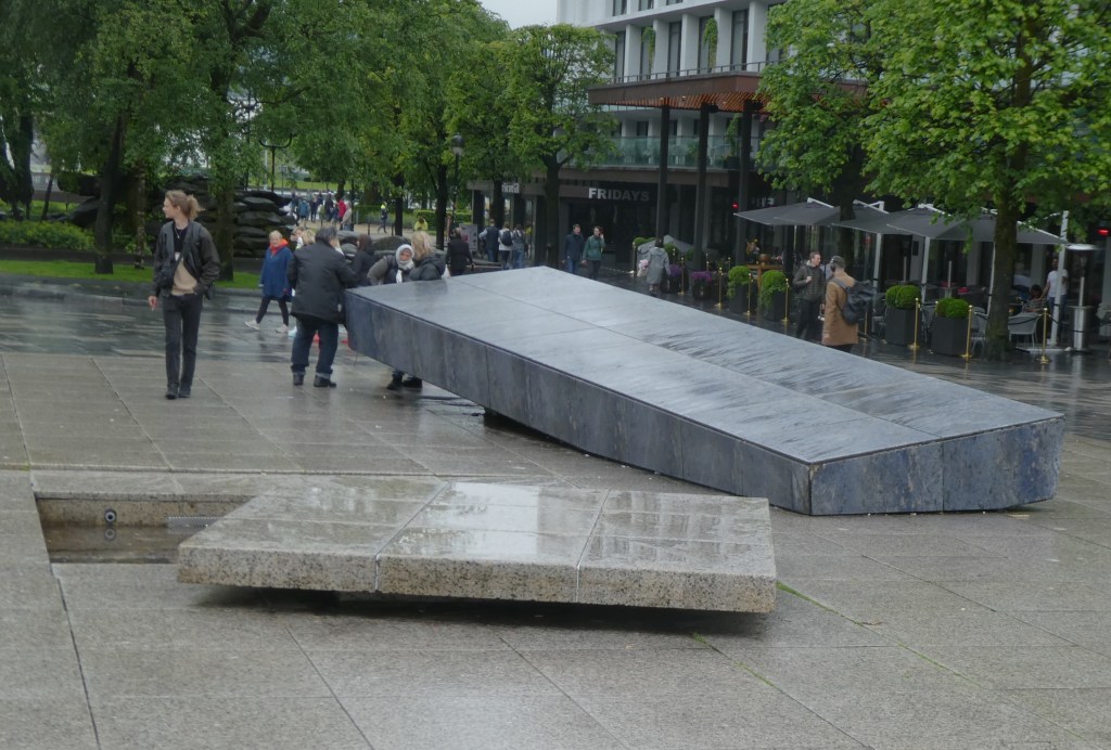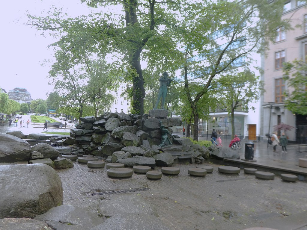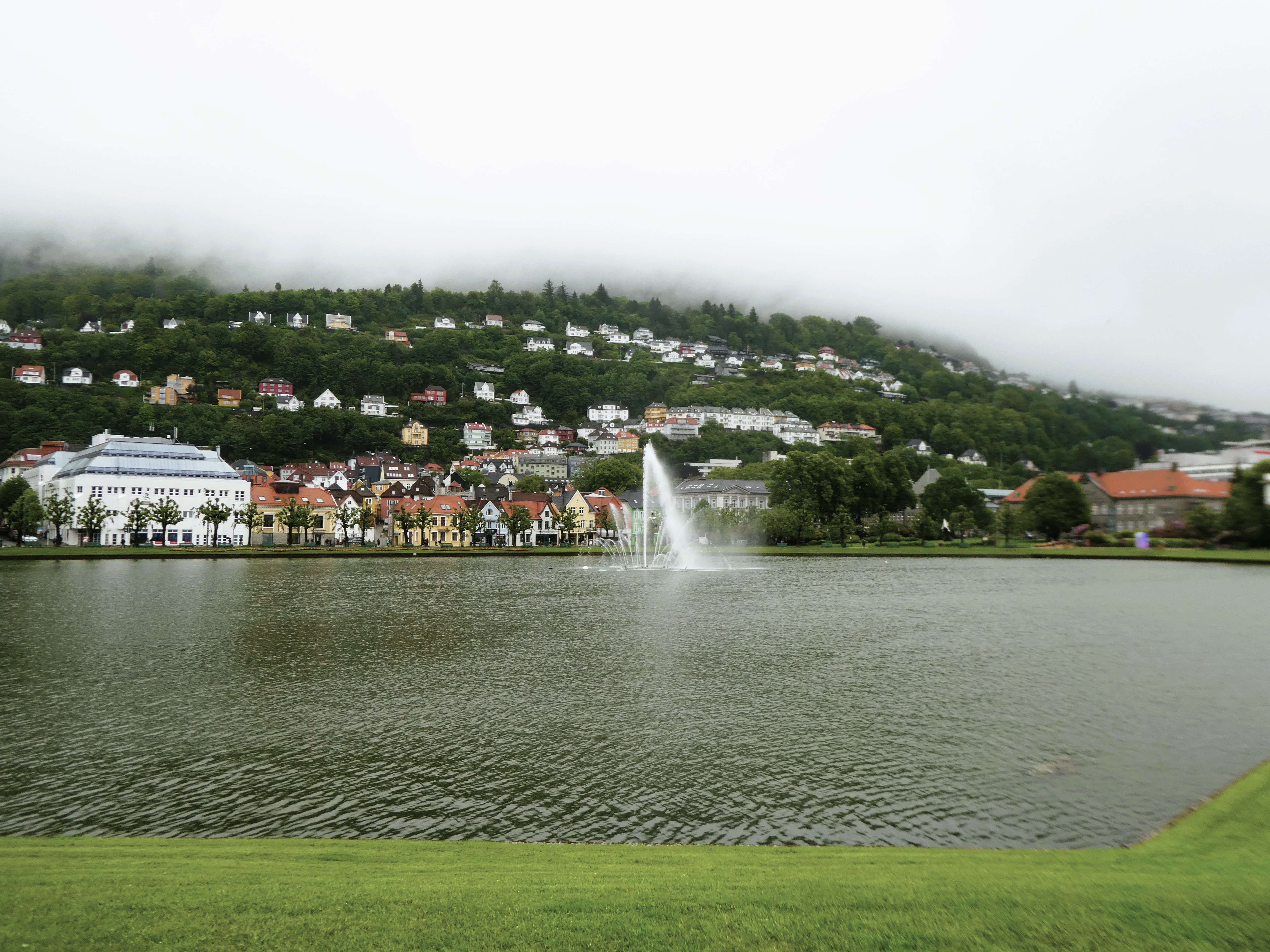 then walked up to the theatre where Ibsen and Bjornson plays had been performed. We walked past the statues of Edvard Grieg and Ole Bull, before visiting the meeting place with fallen pillars. It is so wet it is difficult to focus on what we are seeing. But then as we keep being told Bergen is the wettest city in the world.